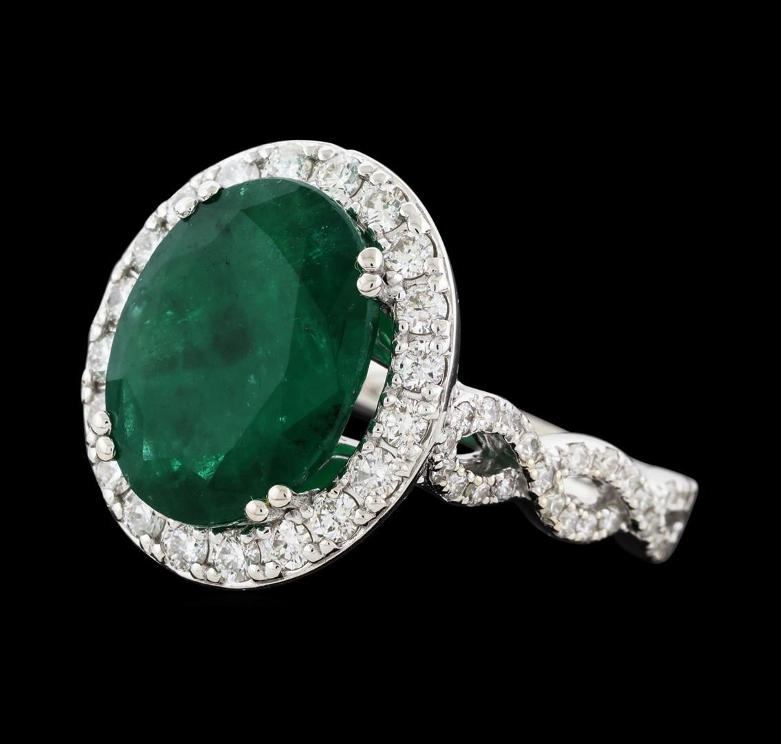 One electronically tested 14KT white gold lady's cast fashion ring with a crossover split shank with a halo with a bright polish finish. The featured lady's ring has a shank measuring 2.64 millimeters wide. Identified with markings of 'K14'. Condition is new, good workmanship. Containing: One prong set oval modified mixed cut natural emerald, measuring 13.43 x 10.37 x 6.03mm, (depth est.) 15%. bulge factor, approximate weight of 5.68ct., clarity is heavily included, medium dark, moderately strong, green color, (GIA G 6/4), cut is good. Transmitting light somewhat diffusely, semi-transparent to translucent. Indications of oil residue. Naturally occurring internal & external characteristics are present. Colored gemstones are presumed to have been subjected to commonly used enhancement processes. Graded in the setting. Twenty prong set round brilliant cut diamonds, measuring 2.00 - 1.90 x 1.17mm (depth est.) approximate total weight of 20 Stones = 0.54ct. Graded in the setting. Clarity SI-1 to I-1. Color: G - I Cut Good Seventy-Six prong set round brilliant cut diamonds, measuring 1.30 - 1.20 x 0.78mm (depth est.) approximate total weight of 76 Stones = 0.57ct. Graded in the setting. Clarity SI-1 to I-1. Color: H - I Cut Good. Total Weight of Colored Stones 5.68ct.. Total Weight of Diamonds 1.11ct.. Total Weight of Ring 7.10gm. GAS Appraised at $10,095.00.