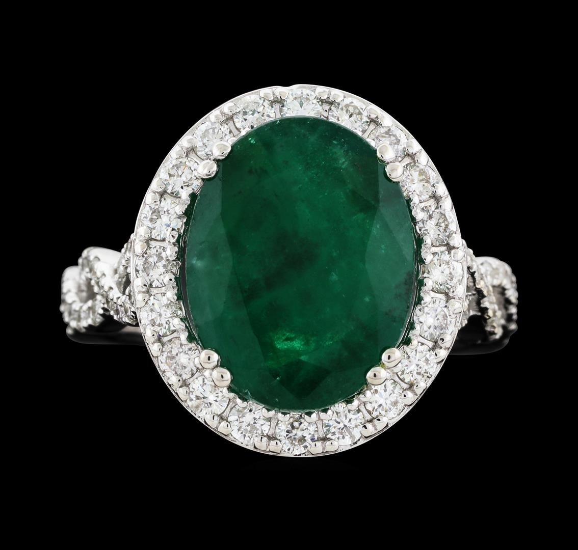 One electronically tested 14KT white gold lady's cast fashion ring with a crossover split shank with a halo with a bright polish finish. The featured lady's ring has a shank measuring 2.64 millimeters wide. Identified with markings of 'K14'. Condition is new, good workmanship. Containing: One prong set oval modified mixed cut natural emerald, measuring 13.43 x 10.37 x 6.03mm, (depth est.) 15%. bulge factor, approximate weight of 5.68ct., clarity is heavily included, medium dark, moderately strong, green color, (GIA G 6/4), cut is good. Transmitting light somewhat diffusely, semi-transparent to translucent. Indications of oil residue. Naturally occurring internal & external characteristics are present. Colored gemstones are presumed to have been subjected to commonly used enhancement processes. Graded in the setting. Twenty prong set round brilliant cut diamonds, measuring 2.00 - 1.90 x 1.17mm (depth est.) approximate total weight of 20 Stones = 0.54ct. Graded in the setting. Clarity SI-1 to I-1. Color: G - I Cut Good Seventy-Six prong set round brilliant cut diamonds, measuring 1.30 - 1.20 x 0.78mm (depth est.) approximate total weight of 76 Stones = 0.57ct. Graded in the setting. Clarity SI-1 to I-1. Color: H - I Cut Good. Total Weight of Colored Stones 5.68ct.. Total Weight of Diamonds 1.11ct.. Total Weight of Ring 7.10gm. GAS Appraised at $10,095.00.