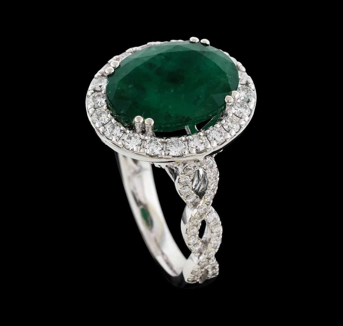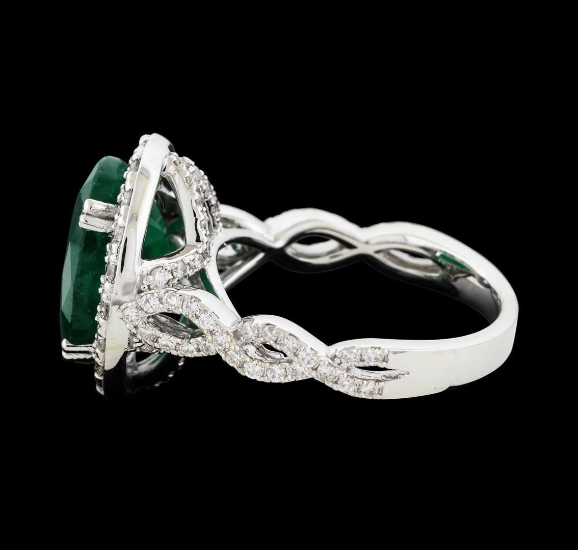One electronically tested 14KT white gold lady's cast fashion ring with a crossover split shank with a halo with a bright polish finish. The featured lady's ring has a shank measuring 2.64 millimeters wide. Identified with markings of 'K14'. Condition is new, good workmanship. Containing: One prong set oval modified mixed cut natural emerald, measuring 13.43 x 10.37 x 6.03mm, (depth est.) 15%. bulge factor, approximate weight of 5.68ct., clarity is heavily included, medium dark, moderately strong, green color, (GIA G 6/4), cut is good. Transmitting light somewhat diffusely, semi-transparent to translucent. Indications of oil residue. Naturally occurring internal & external characteristics are present. Colored gemstones are presumed to have been subjected to commonly used enhancement processes. Graded in the setting. Twenty prong set round brilliant cut diamonds, measuring 2.00 - 1.90 x 1.17mm (depth est.) approximate total weight of 20 Stones = 0.54ct. Graded in the setting. Clarity SI-1 to I-1. Color: G - I Cut Good Seventy-Six prong set round brilliant cut diamonds, measuring 1.30 - 1.20 x 0.78mm (depth est.) approximate total weight of 76 Stones = 0.57ct. Graded in the setting. Clarity SI-1 to I-1. Color: H - I Cut Good. Total Weight of Colored Stones 5.68ct.. Total Weight of Diamonds 1.11ct.. Total Weight of Ring 7.10gm. GAS Appraised.