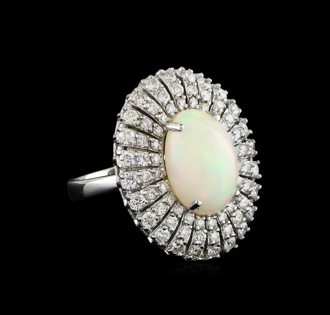 One electronically tested 14KT white gold ladies cast opal and diamond ring with a bright polish finish. The featured opal is set within tiered diamond bezels, completed by a two and one-half millimeter wide band. Identified with markings of "K14". Condition is new, good workmanship. Containing: One semi crystal opal that is cut in a oval shaped cabochon and is prong set, measuring 14.00 mm long x 10.00 mm wide, and 6.40 mm thick and the approximate weight is 5.68 carats. The opal has a bright, red multicolor play of color (fire) in a flashfire pattern; a medium dome; a good cut; no inclusions; minor dull spot in its brightness and pattern; and is somewhat directional. Graded in the setting. Twenty-Four prong set round brilliant cut diamonds, measuring 2.00 - 2.00 x 1.20mm (depth est.) approximate. Total Weight of 24 Stones = 0.80ct. Graded in the setting. Clarity: SI-2 to I-2. Color: F - H Forty-Eight prong set round brilliant cut diamonds, measuring 1.60 - 1.40 x 0.90mm (depth est.) approximate. Total Weight of 48 Stones = 0.69ct. Graded in the setting. Clarity: SI-2 to I-2. Color: F - H. Total Weight of Diamonds 1.49ct. Total Weight of Opals 5.68ct. Total Weight of Ring 10.07gm. AIG Appraised at $7,800.00.