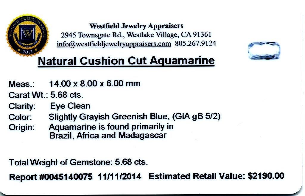 5.68ct. Natural Cushion Cut Aquamarine Westfield Appraised at $2,190.00.
