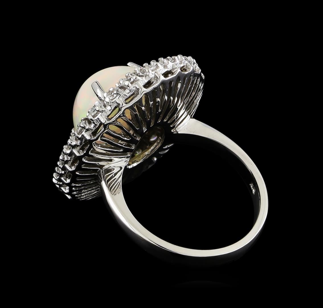 One electronically tested 14KT white gold ladies cast opal and diamond ring with a bright polish finish. The featured opal is set within tiered diamond bezels, completed by a two and one-half millimeter wide band. Identified with markings of "K14". Condition is new, good workmanship. Containing: One semi crystal opal that is cut in a oval shaped cabochon and is prong set, measuring 14.00 mm long x 10.00 mm wide, and 6.40 mm thick and the approximate weight is 5.68 carats. The opal has a bright, red multicolor play of color (fire) in a flashfire pattern; a medium dome; a good cut; no inclusions; minor dull spot in its brightness and pattern; and is somewhat directional. Graded in the setting. Twenty-Four prong set round brilliant cut diamonds, measuring 2.00 - 2.00 x 1.20mm (depth est.) approximate. Total Weight of 24 Stones = 0.80ct. Graded in the setting. Clarity: SI-2 to I-2. Color: F - H Forty-Eight prong set round brilliant cut diamonds, measuring 1.60 - 1.40 x 0.90mm (depth est.) approximate. Total Weight of 48 Stones = 0.69ct. Graded in the setting. Clarity: SI-2 to I-2. Color: F - H. Total Weight of Diamonds 1.49ct. Total Weight of Opals 5.68ct. Total Weight of Ring 10.07gm. AIG Appraised at $7,800.00.