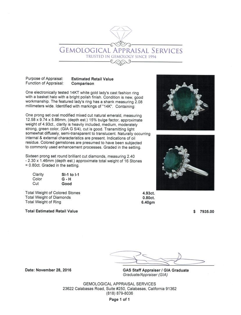 One electronically tested 14KT white gold lady's cast fashion ring with a basket halo with a bright polish finish. The featured lady's ring has a shank measuring 2.08 millimeters wide. Identified with markings of '14K'. Condition is new, good workmanship. Containing: One prong set oval modified mixed cut natural emerald, measuring 12.58 x 9.74 x 5.86mm, (depth est.) 15%. bulge factor, approximate weight of 4.93ct., clarity is heavily included, medium, moderately strong, green color, (GIA G 5/4), cut is good. Transmitting light somewhat diffusely, semi-transparent to translucent. Naturally occurring internal & external characteristics are present. Indications of oil residue. Colored gemstones are presumed to have been subjected to commonly used enhancement processes. Graded in the setting. Sixteen prong set round brilliant cut diamonds, measuring 2.40 - 2.30 x 1.46mm (depth est.) approximate total weight of 16 Stones = 0.80ct. Graded in the setting. Clarity SI-1 to I-1. Color: G - H Cut Good. Total Weight of Colored Stones 4.93ct.. Total Weight of Diamonds 0.80ct.. Total Weight of Ring 6.40gm. GAS Appraised at $7,935.00.
