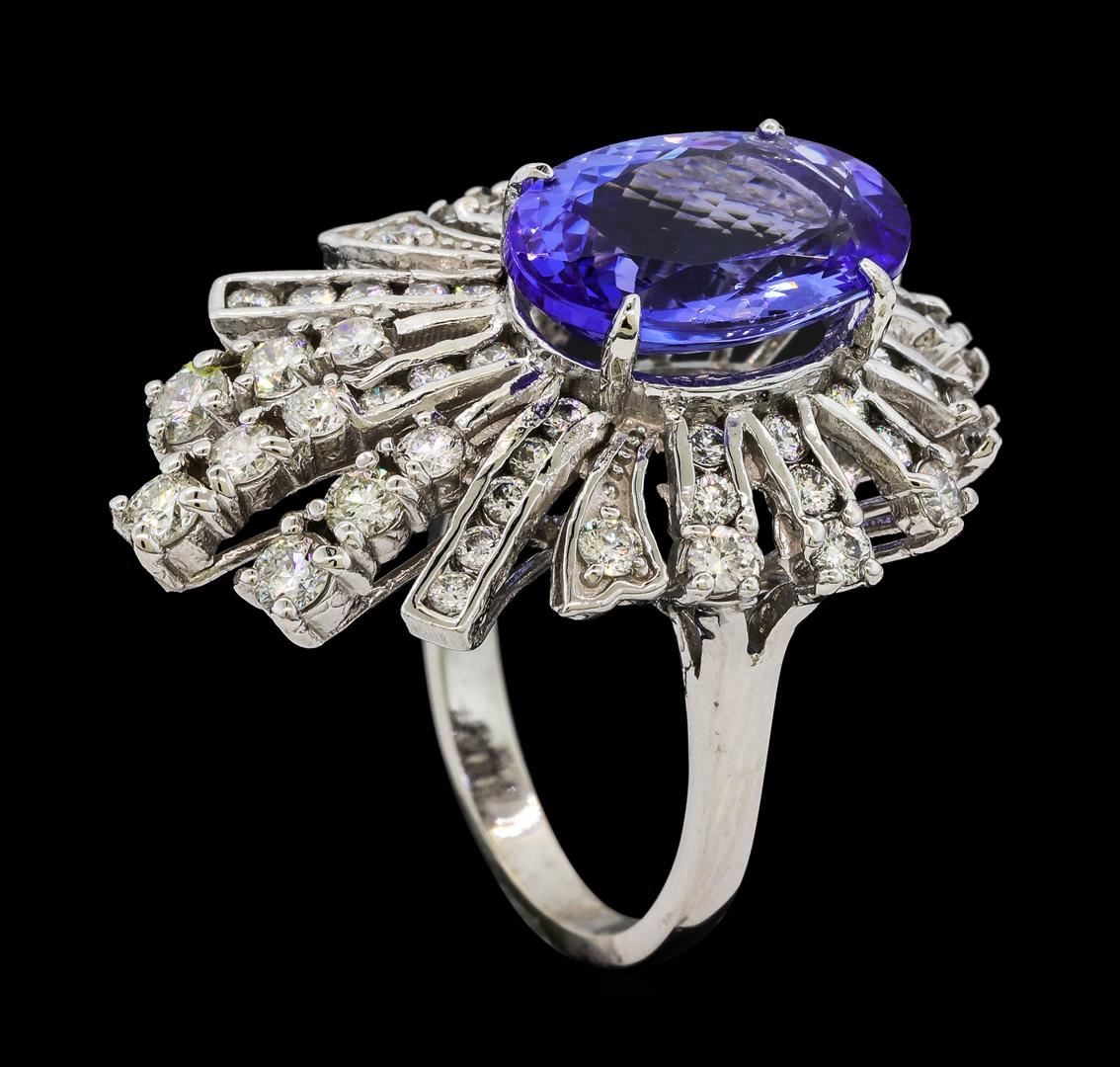 One electronically tested 14KT white gold lady's cast fashion ring with a bright polish finish. The featured lady's ring has a starburst motif and a shank measuring 2.48 millimeters wide. Identified with markings of 'K14'. Condition is new, good workmanship. Containing: One prong set oval modified brilliant cut natural tanzanite, measuring 13.88 x 9.80 x 5.63mm, (depth est.) 6%. bulge factor, approximate total weight of 5.73ct., clarity is eye clean, medium, moderately strong, violetish blue color, (GIA vB 5/4), cut is very good. Transmitting light with no distortion, transparent. Colored gemstones are presumed to have been subjected to commonly used enhancement processes. Graded in the setting. Three prong set round brilliant cut diamonds, measuring 3.00 - 2.90 x 1.77mm (depth est.) approximate total weight of 3 Stones = 0.28ct. Graded in the setting. Clarity SI-1 to SI-2. Color: H - I Cut Good Three prong set round brilliant cut diamonds, measuring 2.70 - 2.60 x 1.59mm (depth est.) approximate total weight of 3 Stones = 0.20ct. Graded in the setting. Clarity SI-1 to SI-2. Color: H - I Cut Good Fourteen prong set round brilliant cut diamonds, measuring 2.30 - 2.20 x 1.35mm (depth est.) approximate total weight of 14 Stones = 0.58ct. Graded in the setting. Clarity SI-1 to SI-2. Color: H - I Cut Good Thirty-One prong set round brilliant cut diamonds, measuring 1.75 - 1.65 x 1.05mm (depth est.) approximate total weight of 31 Stones = 0.58ct. Graded in the setting. Clarity SI-1 to SI-2. Color: H - I Cut Good. Total Weight of Colored Stones 5.73ct.. Total Weight of Diamonds 1.64ct.. Total Weight of Ring 9.90gm. GAS Appraised at $14,455.00.