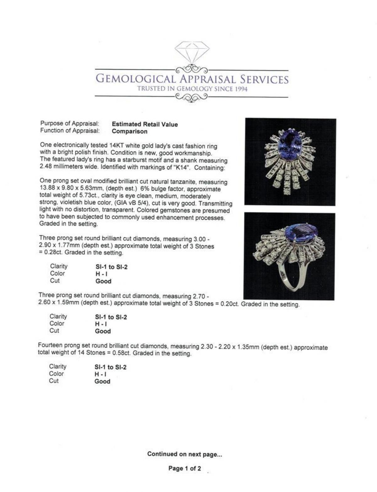 One electronically tested 14KT white gold lady's cast fashion ring with a bright polish finish. The featured lady's ring has a starburst motif and a shank measuring 2.48 millimeters wide. Identified with markings of 'K14'. Condition is new, good workmanship. Containing: One prong set oval modified brilliant cut natural tanzanite, measuring 13.88 x 9.80 x 5.63mm, (depth est.) 6%. bulge factor, approximate total weight of 5.73ct., clarity is eye clean, medium, moderately strong, violetish blue color, (GIA vB 5/4), cut is very good. Transmitting light with no distortion, transparent. Colored gemstones are presumed to have been subjected to commonly used enhancement processes. Graded in the setting. Three prong set round brilliant cut diamonds, measuring 3.00 - 2.90 x 1.77mm (depth est.) approximate total weight of 3 Stones = 0.28ct. Graded in the setting. Clarity SI-1 to SI-2. Color: H - I Cut Good Three prong set round brilliant cut diamonds, measuring 2.70 - 2.60 x 1.59mm (depth est.) approximate total weight of 3 Stones = 0.20ct. Graded in the setting. Clarity SI-1 to SI-2. Color: H - I Cut Good Fourteen prong set round brilliant cut diamonds, measuring 2.30 - 2.20 x 1.35mm (depth est.) approximate total weight of 14 Stones = 0.58ct. Graded in the setting. Clarity SI-1 to SI-2. Color: H - I Cut Good Thirty-One prong set round brilliant cut diamonds, measuring 1.75 - 1.65 x 1.05mm (depth est.) approximate total weight of 31 Stones = 0.58ct. Graded in the setting. Clarity SI-1 to SI-2. Color: H - I Cut Good. Total Weight of Colored Stones 5.73ct.. Total Weight of Diamonds 1.64ct.. Total Weight of Ring 9.90gm. GAS Appraised.