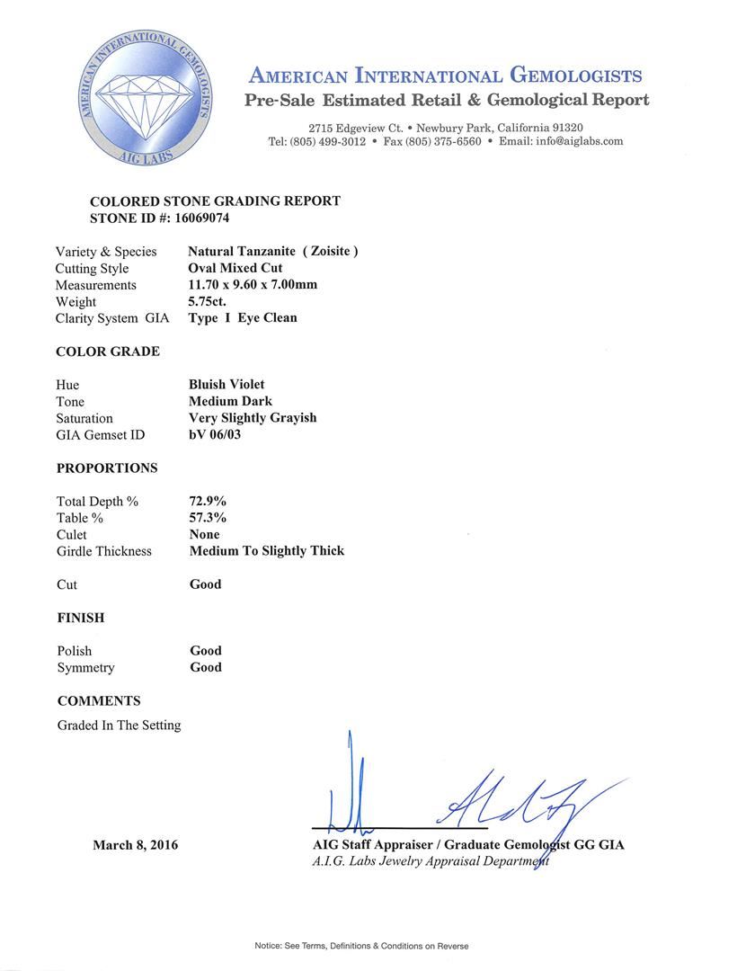 One electronically tested 14KT white gold ladies cast tanzanite and diamond ring with a bright polish finish. The featured tanzanite is set within tiered diamond bezels supported by a lattice under gallery and diamond set tapering shoulders, completed by a three millimeter wide band. Identified with markings of "K14". Condition is new, good workmanship. Containing: One prong set oval mixed cut natural tanzanite, measuring 11.70 x 9.60 x 7.00mm, approximate weight of 5.75ct., clarity is eye clean, type I, medium dark, very slightly grayish, bluish violet color, (GIA bV 6/3), cut is good. Transmitting light with no distortion, transparent. Colored Stone Grading Report attached. Graded in the setting. Tanzanite is a very rare gemstone that is only found in the country of Tanzania. Originally discovered in 1967. Tiffany & Company, named the stone Tanzanite. It is found in the Usumburu Mountains that border the Umba Valley of northern Tanzania. Tanzanite occurs in gray, brown, violet, blue, reddish-purple, & green. The gem is interesting because of its exceptional pleochroism. Rotated in different directions a tanzanite will exhibit multiple changes of color. Tanzanite has a low tolerance to ultrasonic cleaning, and should not be cleaned using this method. One Hundred Twenty-Four prong set round brilliant cut diamonds approximate total weight of 124 Stones = 1.42ct. Graded in the setting. Clarity: SI-2 to I-2. Color: E - G. Total Weight of Colored Stones 5.75ct. Total Weight of Diamonds 1.42ct. Total Weight of Ring 8.47gm. AIG Appraised at $18,135.00.