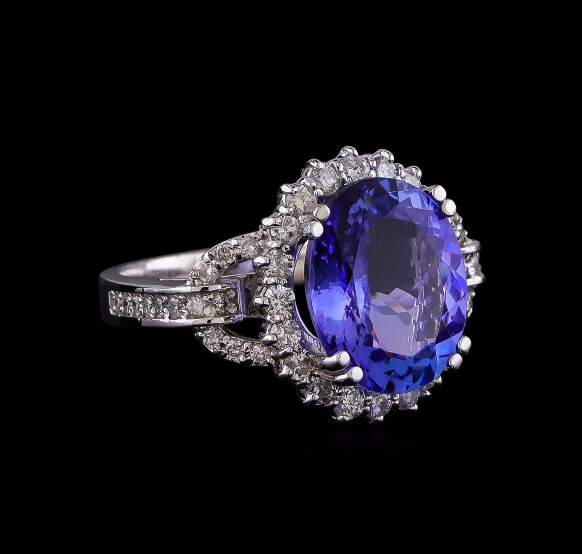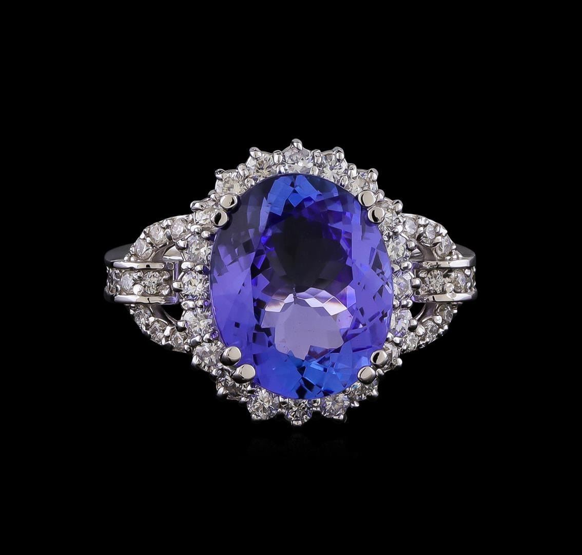 One electronically tested 14KT white gold lady's cast fashion ring with a cathedral basket halo with a bright polish finish. The featured lady's has a shank measuring 2.88 millimeters in width. Identified with markings of "K14". Condition is new, good workmanship. Containing: One prong set oval modified brilliant cut natural tanzanite, measuring 13.05 x 10.60 x 5.86mm, (depth est.) approximate weight of 5.75ct., clarity is eye clean, medium light, moderately strong, violetish blue color, (GIA vB 4/4), cut is very good. Transmitting light with no distortion, transparent. Colored gemstones are presumed to have been subjected to commonly used enhancement processes. Graded in the setting. Twenty prong set round brilliant cut diamonds, measuring 1.95 - 1.90 x 1.18mm (depth est.) approximate total weight of 20 Stones = 0.52ct. Graded in the setting. Clarity: SI-1 to SI-2. Color: G - I. Cut Good Twenty-Eight prong set round brilliant cut diamonds, measuring 1.40 - 1.30 x 0.84mm (depth est.) approximate total weight of 28 Stones = 0.29ct. Graded in the setting. Clarity: SI-1 to SI-2. Color: G - Good. Total Weight of Colored Stones 5.75ct. Total Weight of Diamonds 0.81ct. Total Weight of Ring 7.20gm. GAS Appraised.