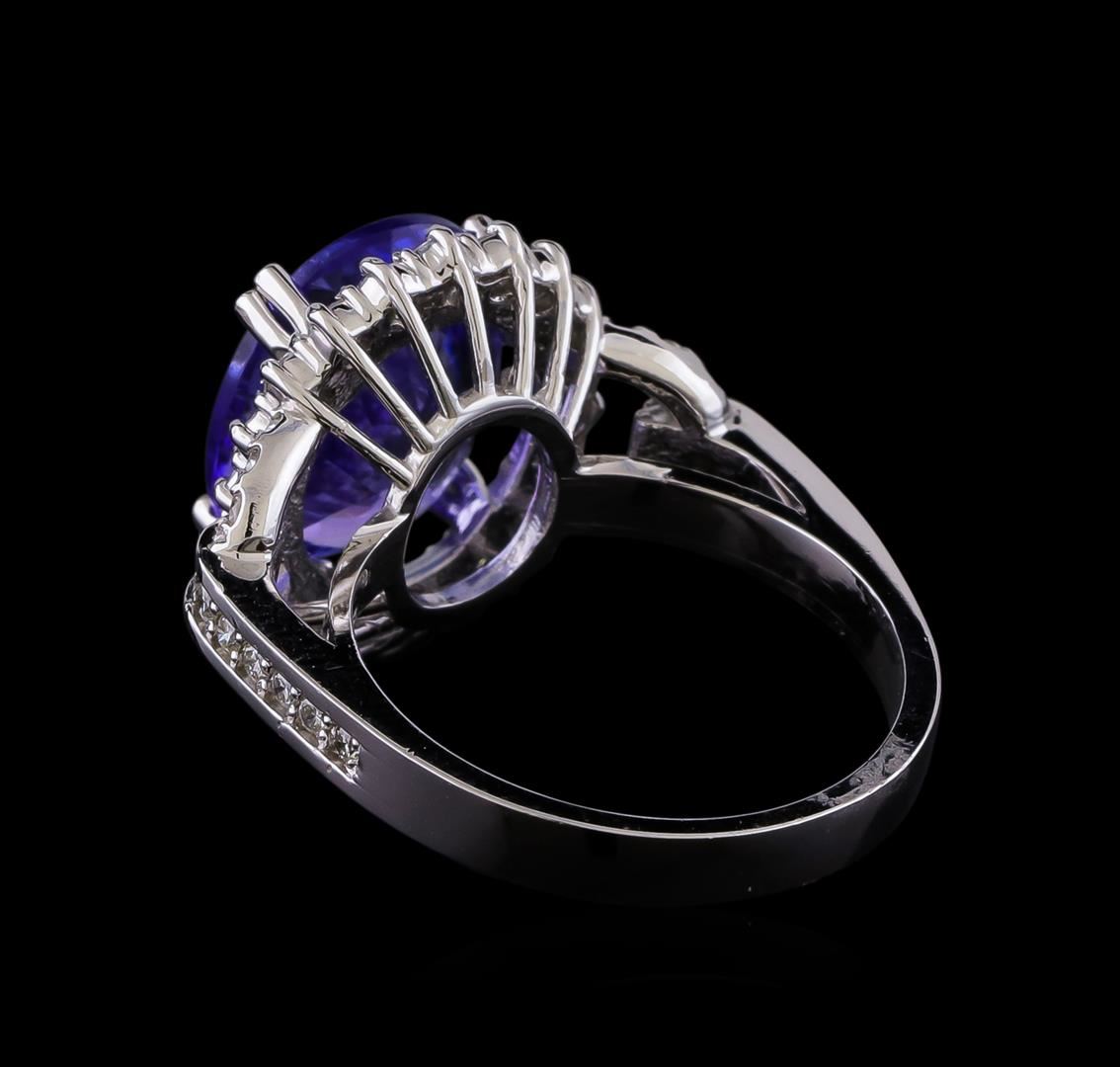 One electronically tested 14KT white gold lady's cast fashion ring with a cathedral basket halo with a bright polish finish. The featured lady's has a shank measuring 2.88 millimeters in width. Identified with markings of "K14". Condition is new, good workmanship. Containing: One prong set oval modified brilliant cut natural tanzanite, measuring 13.05 x 10.60 x 5.86mm, (depth est.) approximate weight of 5.75ct., clarity is eye clean, medium light, moderately strong, violetish blue color, (GIA vB 4/4), cut is very good. Transmitting light with no distortion, transparent. Colored gemstones are presumed to have been subjected to commonly used enhancement processes. Graded in the setting. Twenty prong set round brilliant cut diamonds, measuring 1.95 - 1.90 x 1.18mm (depth est.) approximate total weight of 20 Stones = 0.52ct. Graded in the setting. Clarity: SI-1 to SI-2. Color: G - I. Cut Good Twenty-Eight prong set round brilliant cut diamonds, measuring 1.40 - 1.30 x 0.84mm (depth est.) approximate total weight of 28 Stones = 0.29ct. Graded in the setting. Clarity: SI-1 to SI-2. Color: G - Good. Total Weight of Colored Stones 5.75ct. Total Weight of Diamonds 0.81ct. Total Weight of Ring 7.20gm. GAS Appraised.