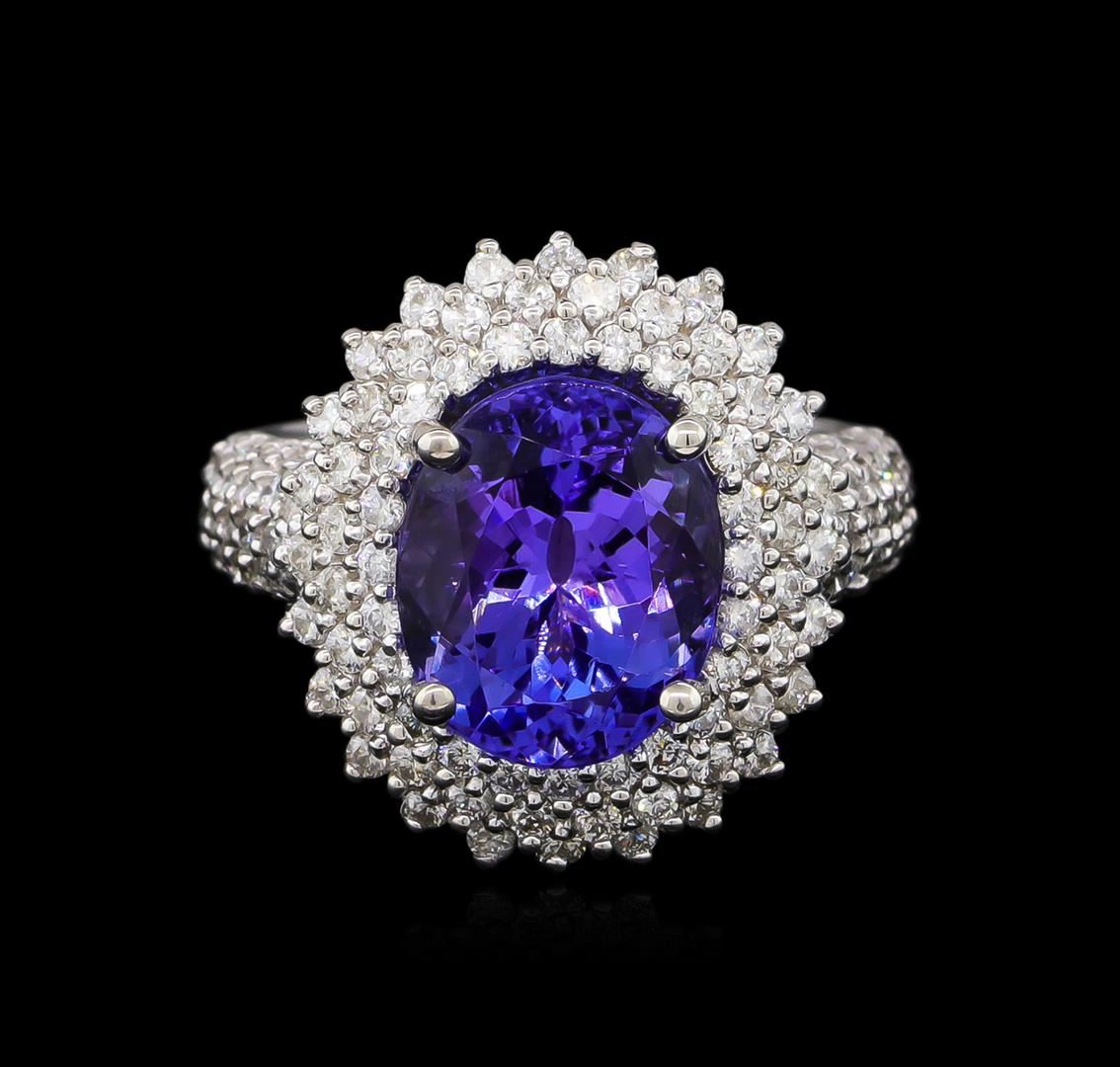 One electronically tested 14KT white gold ladies cast tanzanite and diamond ring with a bright polish finish. The featured tanzanite is set within tiered diamond bezels supported by a lattice under gallery and diamond set tapering shoulders, completed by a three millimeter wide band. Identified with markings of "K14". Condition is new, good workmanship. Containing: One prong set oval mixed cut natural tanzanite, measuring 11.70 x 9.60 x 7.00mm, approximate weight of 5.75ct., clarity is eye clean, type I, medium dark, very slightly grayish, bluish violet color, (GIA bV 6/3), cut is good. Transmitting light with no distortion, transparent. Colored Stone Grading Report attached. Graded in the setting. Tanzanite is a very rare gemstone that is only found in the country of Tanzania. Originally discovered in 1967. Tiffany & Company, named the stone Tanzanite. It is found in the Usumburu Mountains that border the Umba Valley of northern Tanzania. Tanzanite occurs in gray, brown, violet, blue, reddish-purple, & green. The gem is interesting because of its exceptional pleochroism. Rotated in different directions a tanzanite will exhibit multiple changes of color. Tanzanite has a low tolerance to ultrasonic cleaning, and should not be cleaned using this method. One Hundred Twenty-Four prong set round brilliant cut diamonds approximate total weight of 124 Stones = 1.42ct. Graded in the setting. Clarity: SI-2 to I-2. Color: E - G. Total Weight of Colored Stones 5.75ct. Total Weight of Diamonds 1.42ct. Total Weight of Ring 8.47gm. AIG Appraised at $18,135.00.