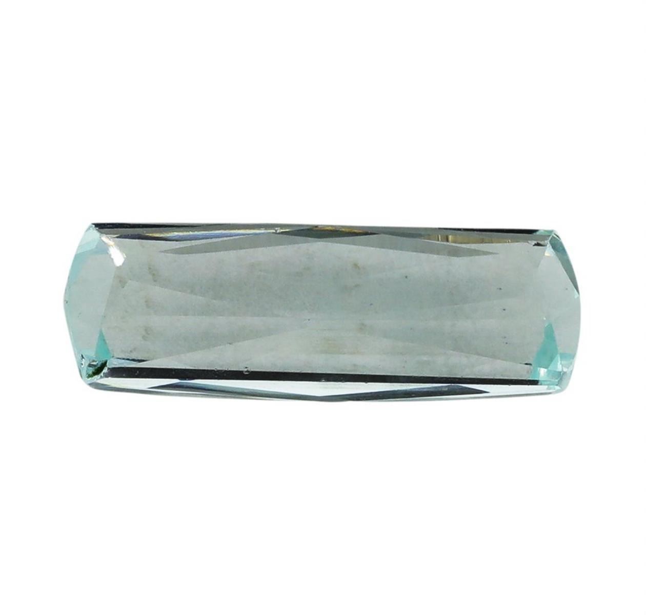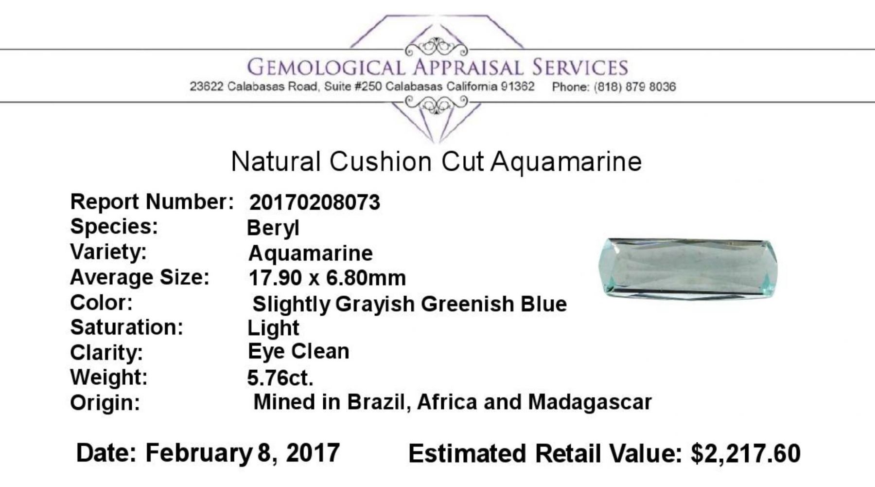 One natural cushion cut aquamarine with an exact weight of 5.76ct., clarity is eye clean, slightly grayish greenish blue, light. Gemological Appraisals Services estimates the retail value at $2217.6 GAS Appraised.