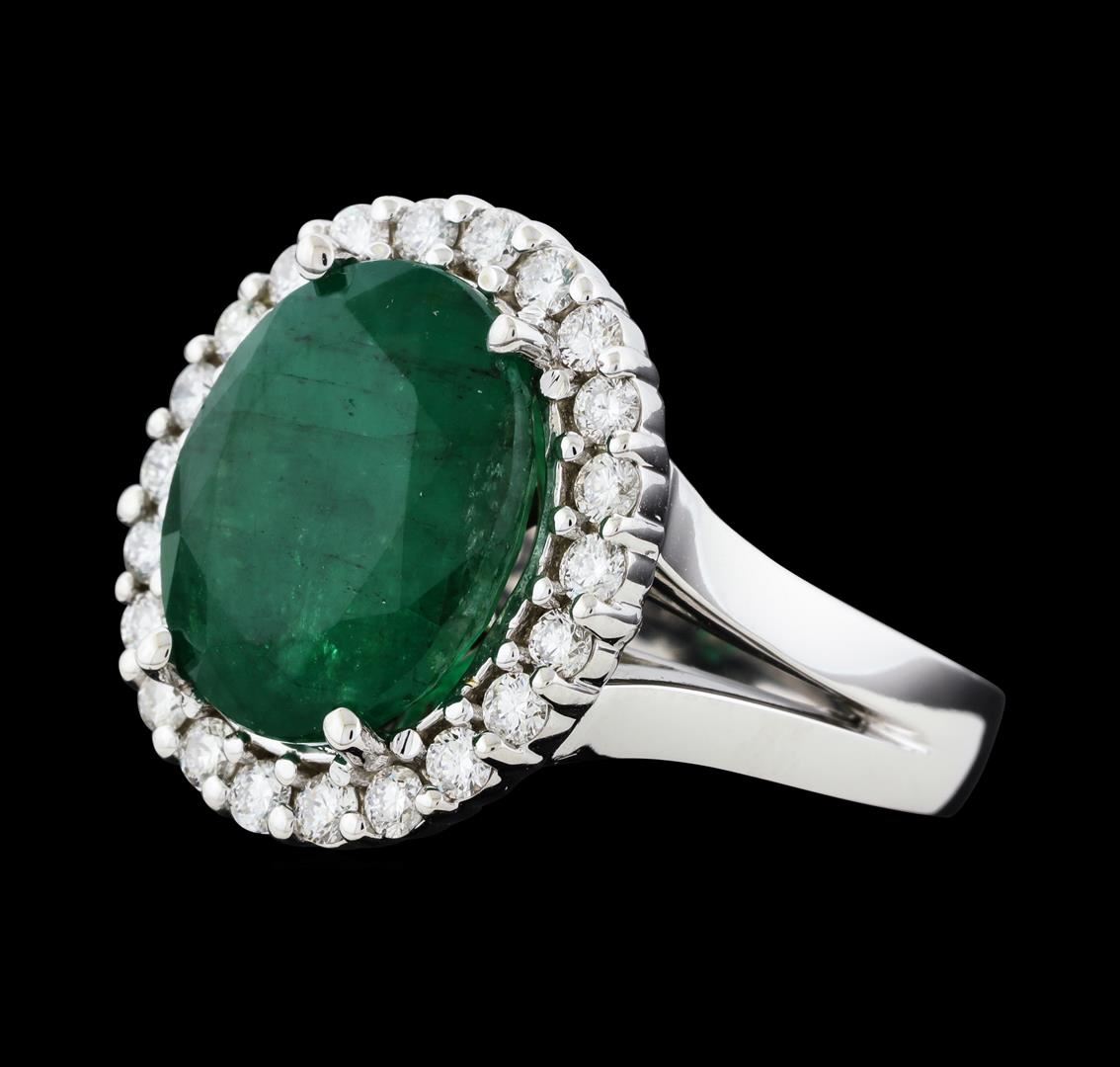 One electronically tested 14KT white gold lady's cast fashion ring with a split shank basket halo with a bright polish finish. The featured lady's ring has a shank measuring 3.29 millimeters wide. Identified with markings of '14K'. Condition is new, good workmanship. Containing: One prong set oval modified mixed cut natural emerald, measuring 13.24 x 10.86 x 6.40mm, (depth est.) 10%. bulge factor, approximate weight of 5.76ct., clarity is heavily included, medium dark, moderately strong, green color, (GIA G 6/4), cut is good. Transmitting light somewhat diffusely, semi-transparent to translucent. Indications of oil residue. Naturally occurring internal & external characteristics are present. Colored gemstones are presumed to have been subjected to commonly used enhancement processes. Graded in the setting. Twenty-Two prong set round brilliant cut diamonds, measuring 2.00 - 1.90 x 1.19mm (depth est.) approximate total weight of 22 Stones = 0.60ct. Graded in the setting. Clarity SI-1 to SI-3. Color: H - I Cut Good. Total Weight of Colored Stones 5.76ct.. Total Weight of Diamonds 0.60ct.. Total Weight of Ring 10.20gm. GAS Appraised at $8,920.00.