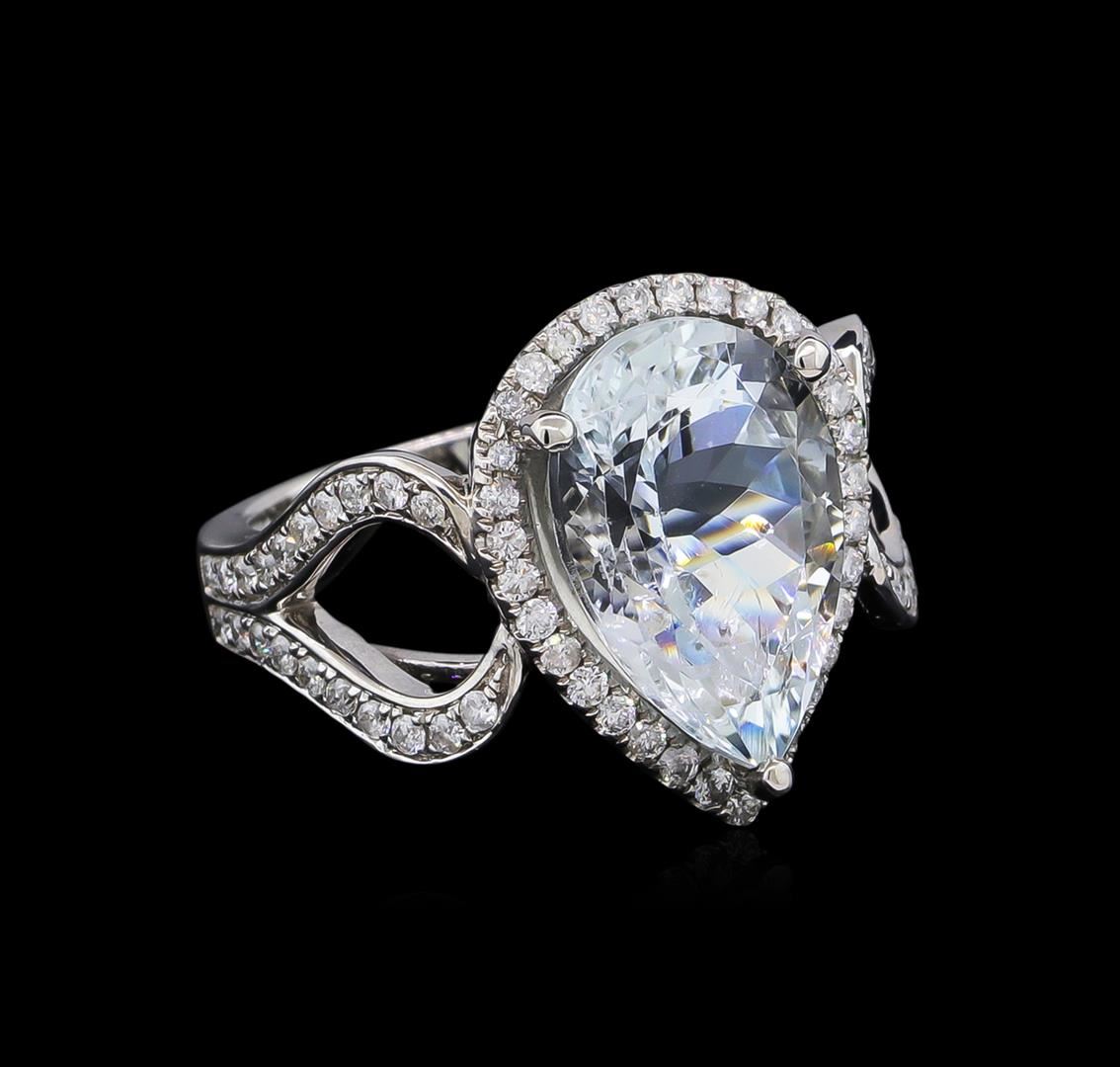One electronically tested 14KT white gold lady's cast fashion ring with a split shank halo with a bright polish finish. The featured lady's ring has a shank measuring 3.42 millimeters wide. Identified with markings of "14K". Condition is new, good workmanship. Containing: One prong set pear modified brilliant cut natural aquamarine, measuring 15.00 x 9.90 x 7.91mm, approximate weight of 5.77ct., clarity is slightly included, type I, light, very slightly grayish, very slightly greenish blue color, (GIA vslgB 3/3), cut is very good. Transmitting light with no distortion, transparent. Colored gemstones are presumed to have been subjected to commonly used enhancement processes. Graded in the setting. Seventy-Two prong set round brilliant cut diamonds, measuring 1.40 - 1.30 x 0.84mm (depth est.) approximate total weight of 72 Stones = 0.68ct. Clarity: SI-1 to I-1. Color: G - H. Cut Good. Total Weight of Colored Stones 5.77ct. Total Weight of Diamonds 0.68ct. Total Weight of Ring 8.30gm. GAS Appraised at $9,490.00.