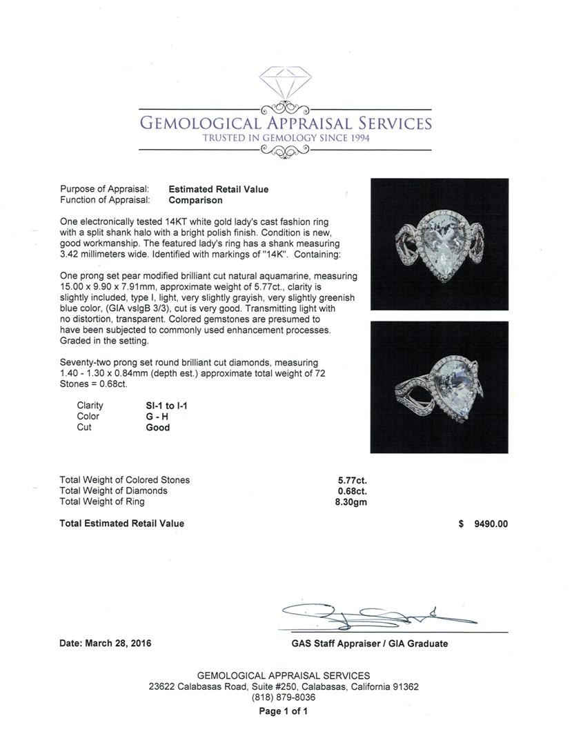 One electronically tested 14KT white gold lady's cast fashion ring with a split shank halo with a bright polish finish. The featured lady's ring has a shank measuring 3.42 millimeters wide. Identified with markings of "14K". Condition is new, good workmanship. Containing: One prong set pear modified brilliant cut natural aquamarine, measuring 15.00 x 9.90 x 7.91mm, approximate weight of 5.77ct., clarity is slightly included, type I, light, very slightly grayish, very slightly greenish blue color, (GIA vslgB 3/3), cut is very good. Transmitting light with no distortion, transparent. Colored gemstones are presumed to have been subjected to commonly used enhancement processes. Graded in the setting. Seventy-Two prong set round brilliant cut diamonds, measuring 1.40 - 1.30 x 0.84mm (depth est.) approximate total weight of 72 Stones = 0.68ct. Clarity: SI-1 to I-1. Color: G - H. Cut Good. Total Weight of Colored Stones 5.77ct. Total Weight of Diamonds 0.68ct. Total Weight of Ring 8.30gm. GAS Appraised at $9,490.00.