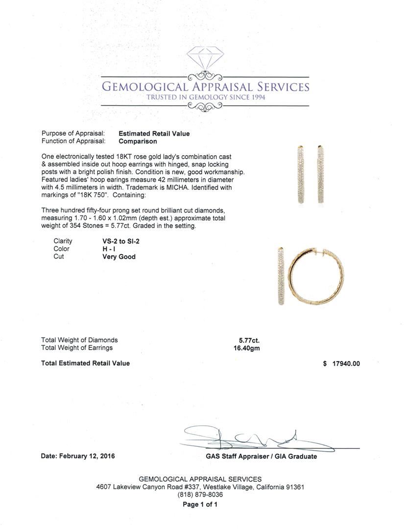 One electronically tested 18KT rose gold lady's combination cast & assembled inside out hoop earrings with hinged, snap locking posts with a bright polish finish. Featured ladies' hoop earrings measure 42 millimeters in diameter with 4.5 millimeters in width. Trademark is MICHA. Identified with markings of "18K 750". Condition is new, good workmanship. Containing: Three Hundred Fifty-Four prong set round brilliant cut diamonds, measuring 1.70 - 1.60 x 1.02mm (depth est.) approximate total weight of 354 Stones = 5.77ct. Graded in the setting. Clarity: VS-2 to SI-2. Color: H - I. Cut Very Good. Total Weight of Diamonds 5.77ct. Total Weight of Earrings 16.40gm. GAS Appraised at $17,940.00.