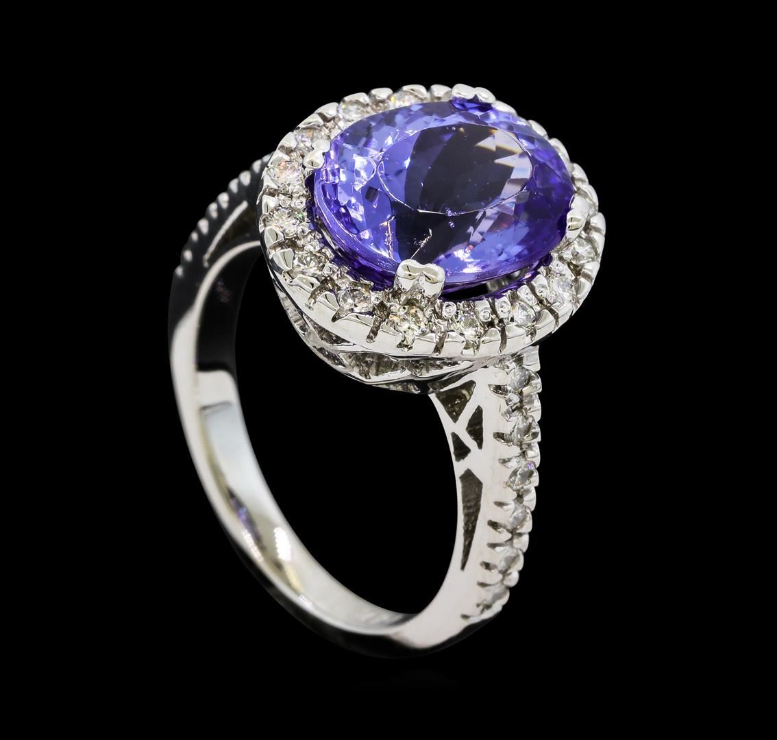 One electronically tested 14KT white gold lady's cast fashion ring with a cathedral shank with a halo with a bright polish finish. The featured lady's ring has a shank measuring 2.46 millimeters wide. Identified with markings of '14K'. Condition is new, good workmanship. Containing: One prong set oval modified brilliant cut natural tanzanite, measuring 12.13 x 9.66 x 7.54mm, (depth est.) approximate weight of 5.77ct., clarity is eye clean, medium, moderately strong, violet color, (GIA V 5/4), cut is very good. Transmitting light with no distortion, transparent. Colored gemstones are presumed to have been subjected to commonly used enhancement processes. Graded in the setting. Twenty-Eight prong set round brilliant cut diamonds, measuring 1.70 - 1.65 x 1.04mm (depth est.) approximate total weight of 28 Stones = 0.50ct. Graded in the setting. Clarity SI-1 to I-1. Color: G - H Cut Good. Total Weight of Colored Stones 5.77ct.. Total Weight of Diamonds 0.50ct.. Total Weight of Ring 7.20gm. GAS Appraised at $9,410.00.