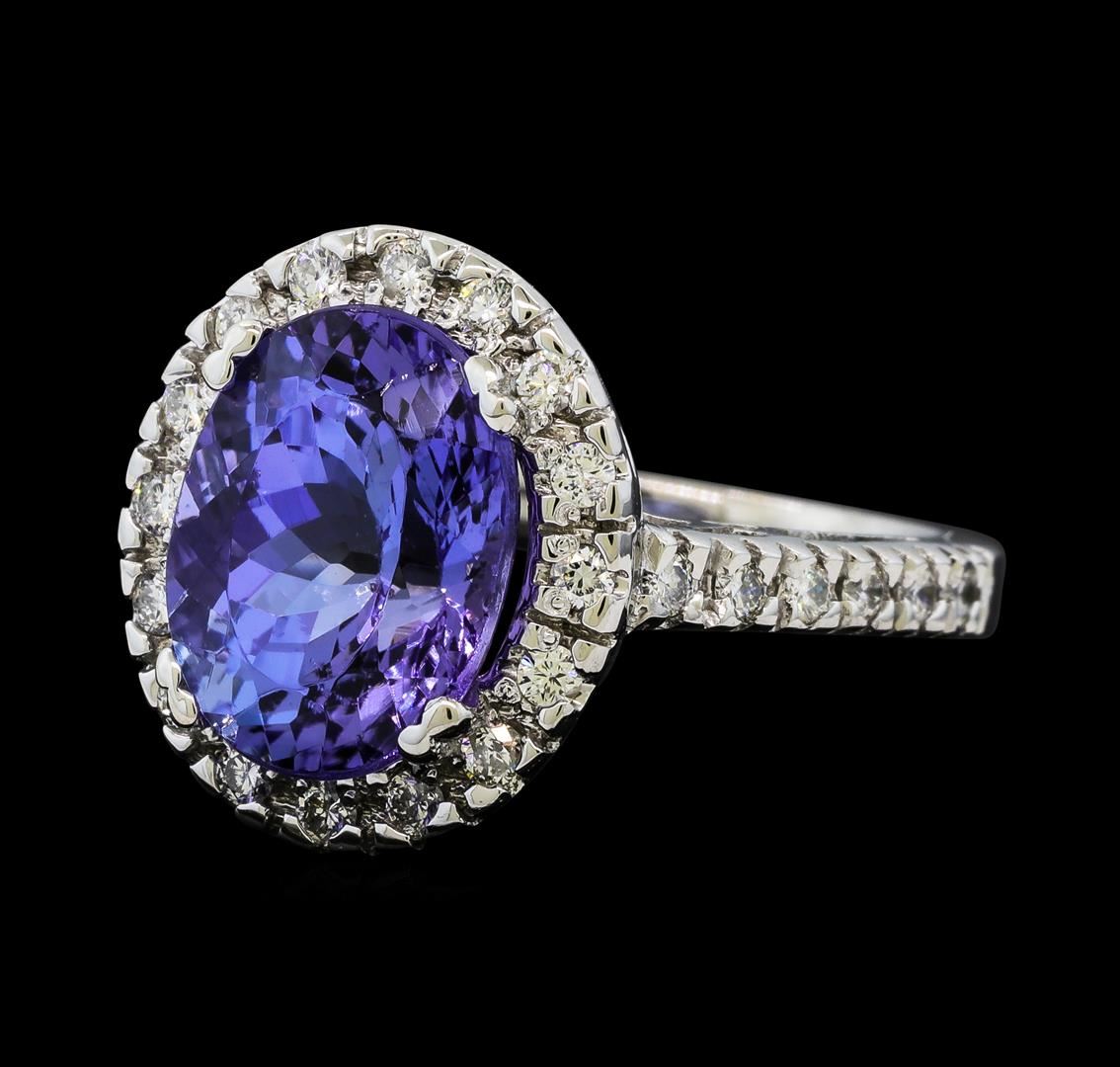 One electronically tested 14KT white gold lady's cast fashion ring with a cathedral shank with a halo with a bright polish finish. The featured lady's ring has a shank measuring 2.46 millimeters wide. Identified with markings of '14K'. Condition is new, good workmanship. Containing: One prong set oval modified brilliant cut natural tanzanite, measuring 12.13 x 9.66 x 7.54mm, (depth est.) approximate weight of 5.77ct., clarity is eye clean, medium, moderately strong, violet color, (GIA V 5/4), cut is very good. Transmitting light with no distortion, transparent. Colored gemstones are presumed to have been subjected to commonly used enhancement processes. Graded in the setting. Twenty-Eight prong set round brilliant cut diamonds, measuring 1.70 - 1.65 x 1.04mm (depth est.) approximate total weight of 28 Stones = 0.50ct. Graded in the setting. Clarity SI-1 to I-1. Color: G - H Cut Good. Total Weight of Colored Stones 5.77ct.. Total Weight of Diamonds 0.50ct.. Total Weight of Ring 7.20gm. GAS Appraised at $9,410.00.