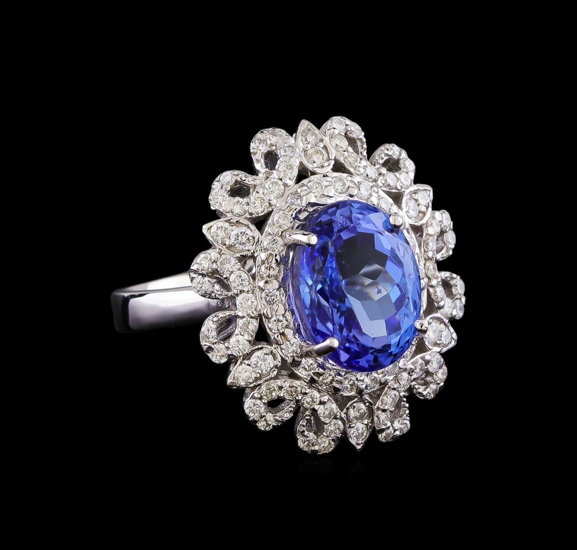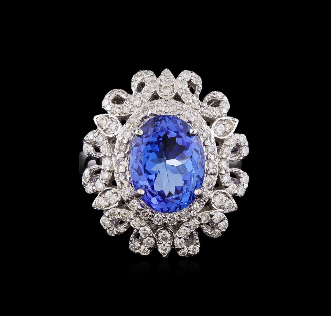 One electronically tested 14KT white gold lady's cast fashion ring with a scallop basket halo with a bright polish finish. The featured lady's has a shank measuring 3.18 millimeters in width. Identified with markings of "K14". Condition is new, good workmanship. Containing: One prong set oval modified brilliant cut natural tanzanite, measuring 11.64 x 9.02 x 6.85mm, (depth est.) 10%. bulge factor, approximate weight of 5.78ct., clarity is eye clean, medium light, moderately strong, violetish blue color, (GIA vB 4/4), cut is good. Transmitting light with no distortion, transparent. Colored gemstones are presumed to have been subjected to commonly used enhancement processes. Graded in the setting. Twelve prong set round brilliant cut diamonds, measuring 1.55 - 1.50 x 0.95mm (depth est.) approximate total weight of 12 Stones = 0.18ct. Graded in the setting. Clarity: SI-1 to SI-2. Color: H - I. Cut Good Seventy-Six prong set round brilliant cut diamonds, measuring 1.40 - 1.35 x 0.86mm (depth est.) approximate total weight of 76 Stones = 0.77ct. Graded in the setting. Clarity: SI-1 to SI-2. Color: H - I. Cut Good. Total Weight of Colored Stones 5.78ct. Total Weight of Diamonds 0.95ct. Total Weight of Ring 7.90gm. GAS Appraised.