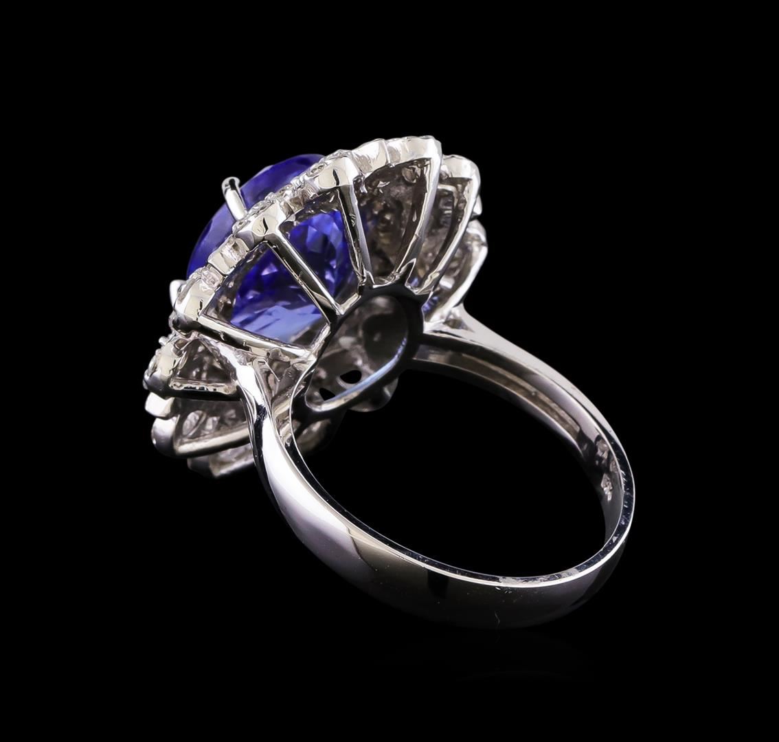 One electronically tested 14KT white gold lady's cast fashion ring with a scallop basket halo with a bright polish finish. The featured lady's has a shank measuring 3.18 millimeters in width. Identified with markings of "K14". Condition is new, good workmanship. Containing: One prong set oval modified brilliant cut natural tanzanite, measuring 11.64 x 9.02 x 6.85mm, (depth est.) 10%. bulge factor, approximate weight of 5.78ct., clarity is eye clean, medium light, moderately strong, violetish blue color, (GIA vB 4/4), cut is good. Transmitting light with no distortion, transparent. Colored gemstones are presumed to have been subjected to commonly used enhancement processes. Graded in the setting. Twelve prong set round brilliant cut diamonds, measuring 1.55 - 1.50 x 0.95mm (depth est.) approximate total weight of 12 Stones = 0.18ct. Graded in the setting. Clarity: SI-1 to SI-2. Color: H - I. Cut Good Seventy-Six prong set round brilliant cut diamonds, measuring 1.40 - 1.35 x 0.86mm (depth est.) approximate total weight of 76 Stones = 0.77ct. Graded in the setting. Clarity: SI-1 to SI-2. Color: H - I. Cut Good. Total Weight of Colored Stones 5.78ct. Total Weight of Diamonds 0.95ct. Total Weight of Ring 7.90gm. GAS Appraised.