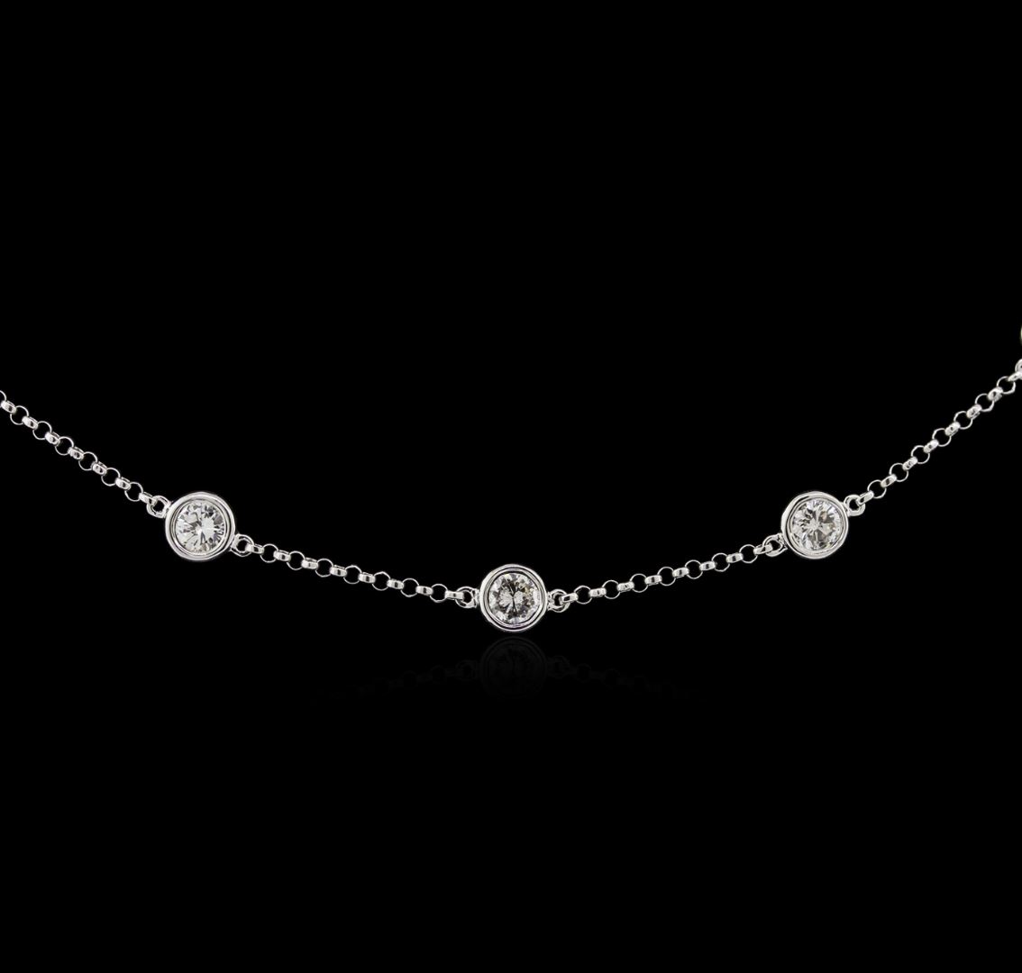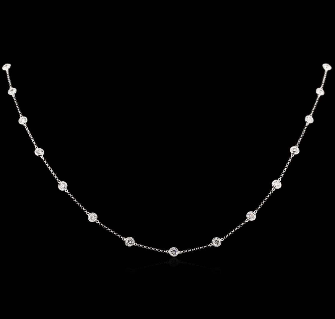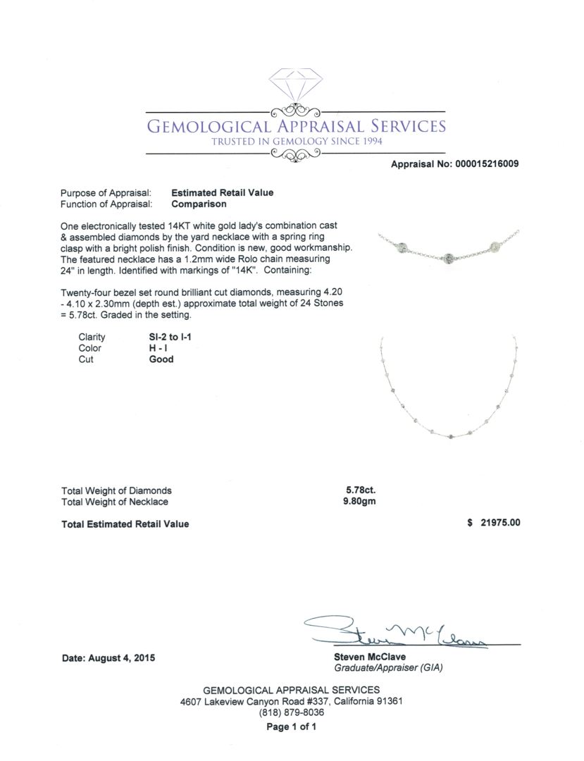 One electronically tested 14KT white gold lady's combination cast & assembled diamonds by the yard necklace with a spring ring clasp with a bright polish finish. The featured necklace has a 1.2mm wide Rolo chain measuring 24" in length. Identified with markings of "14K". Condition is new, good workmanship. Containing: Twenty-Four bezel set round brilliant cut diamonds, measuring 4.20 - 4.10 x 2.30mm (depth est.) approximate total weight of 24 Stones = 5.78ct. Graded in the setting. Clarity SI-2 to I-1 Color H - I. Cut Good Total Weight of Diamonds 5.78ct. Total Weight of Necklace 9.80gm GAS Appraised at $21,975.00.