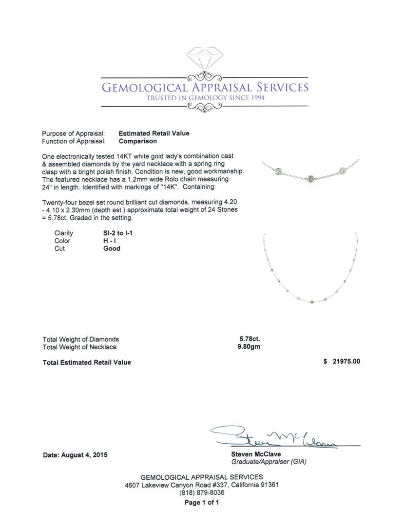 One electronically tested 14KT white gold lady's combination cast & assembled diamonds by the yard necklace with a spring ring clasp with a bright polish finish. The featured necklace has a 1.2mm wide Rolo chain measuring 24" in length. Identified with markings of "14K". Condition is new, good workmanship. Containing: Twenty-Four bezel set round brilliant cut diamonds, measuring 4.20 - 4.10 x 2.30mm (depth est.) approximate total weight of 24 Stones = 5.78ct. Graded in the setting. Clarity SI-2 to I-1 Color H - I. Cut Good Total Weight of Diamonds 5.78ct. Total Weight of Necklace 9.80gm GAS Appraised at $21,975.00.