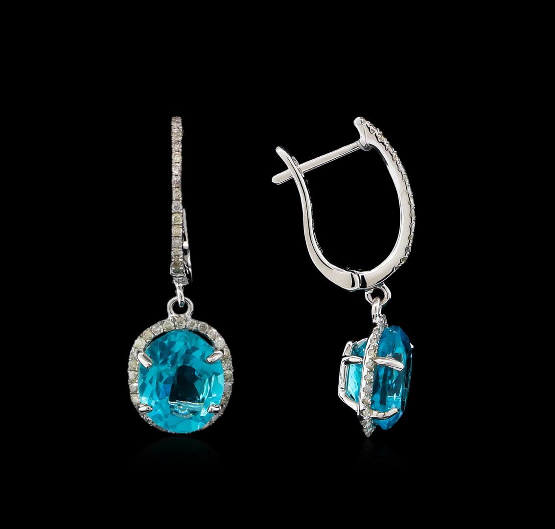 One pair electronically tested 14KT white gold lady's combination cast & assembled fashion earring with hinged, snap locking posts with a dangle halo with a bright polish finish. Trademark is Orianne. Identified with markings of "14K". Condition is new, good workmanship. Containing: Two prong set oval modified brilliant cut natural apatites, measuring 10.00 x 8.08 x 5.25mm, 3%. bulge factor, approximate total weight of 5.79ct., clarity is moderately included, medium, moderately strong, bluish green color, (GIA bG 5/4), cut is good. Transmitting light with a minimum of distortion, transparent. Colored gemstones are presumed to have been subjected to commonly used enhancement processes. Graded in the setting. Fifty-Eight prong set round brilliant cut diamonds, measuring 1.30 - 1.25 x 0.77mm (depth est.) approximate total weight of 58 Stones = 0.47ct. Graded in the setting. Clarity: I-1 to I-2. Color: H - Good. Total Weight of Colored Stones 5.79ct. Total Weight of Diamonds 0.47ct. Total Weight of Earring 3.70gm. GAS Appraised at $5,050.00.