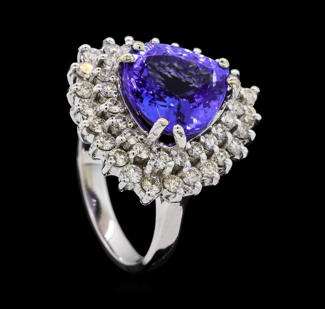 One electronically tested 14KT white gold lady's cast fashion ring with a double basket halo with a bright polish finish. The featured lady's ring has a shank measuring 2.67 millimeters wide. Identified with markings of 'K14'. Condition is new, good workmanship. Containing: One prong set pear modified brilliant cut natural tanzanite, measuring 11.55 x 11.62 x 6.47mm, (depth est.) approximate weight of 5.79ct., clarity is eye clean, medium, moderately strong, violet color, (GIA V 5/4), cut is very good. Transmitting light with no distortion, transparent. Colored gemstones are presumed to have been subjected to commonly used enhancement processes. Graded in the setting. Twenty-Four prong set round brilliant cut diamonds, measuring 2.10 - 2.05 x 1.27mm (depth est.) approximate total weight of 24 Stones = 0.80ct. Graded in the setting. Clarity SI-1 to SI-2. Color: H - I Cut Good Twenty-One prong set round brilliant cut diamonds, measuring 1.90 - 1.80 x 1.15mm (depth est.) approximate total weight of 21 Stones = 0.51ct. Graded in the setting. Clarity SI-1 to SI-2. Color: H - I Cut Good. Total Weight of Colored Stones 5.79ct.. Total Weight of Diamonds 1.31ct.. Total Weight of Ring 10.00gm. GAS Appraised at $13,185.00.