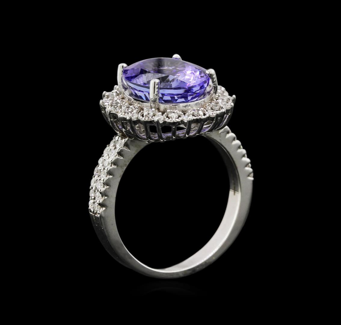 One electronically tested 14KT white gold lady's cast fashion ring with a split shank halo with a bright polish finish. The featured lady's ring has a shank measuring 2.78 millimeters wide. Identified with markings of "K14". Condition is new, good workmanship. Containing: One prong set oval modified brilliant cut natural tanzanite, measuring 12.00 x 9.87 x 7.34mm, approximate weight of 5.80ct., clarity is eye clean, type I, medium light, moderately strong, bluish violet color, (GIA bV 4/4), cut is very good. Transmitting light with no distortion, transparent. Colored gemstones are presumed to have been subjected to commonly used enhancement processes. Graded in the setting. Fifty-Six prong set round brilliant cut diamonds, measuring 1.25 - 1.20 x 0.74mm (depth est.) approximate total weight of 56 Stones = 0.38ct. Graded in the setting. Clarity: SI-1 to I-1. Color: G - Good. Total Weight of Colored Stones 5.80ct. Total Weight of Diamonds 0.38ct. Total Weight of Ring 6.40gm. GAS Appraised at $9,750.00.