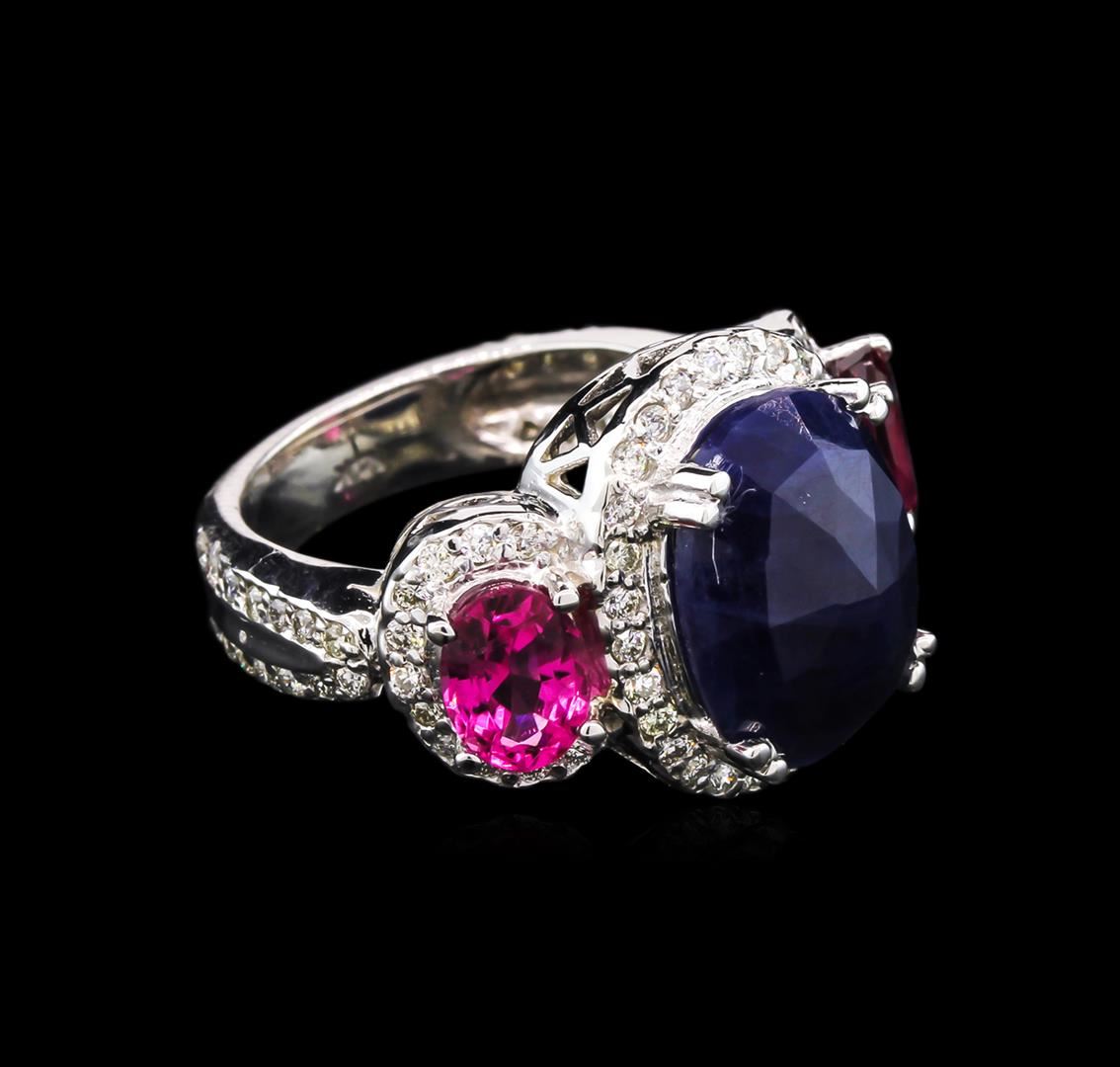 One 14KT white gold ring weighing 7.58 grams containing: 1 center oval shape burma natural blue sapphire with a total approximate weight of 5.81ct, 2 oval shape pink tourmaline with a total approximate weight of 1.90ct, and round cut diamonds with a total approximate weight of 0.86ct. Diamonds: All VS-SI clarity; G-H color. Fine cutting/proportions. RBGS Appraised at $12,000.00.