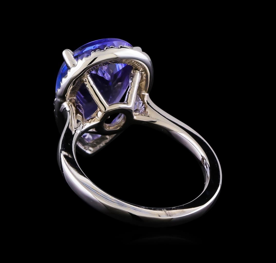 One electronically tested 14KT white gold lady's cast fashion ring with a cathedral halo with a bright polish finish. The featured lady's has a shank measuring 1.85 millimeters in width. Identified with markings of "14K". Condition is new, good workmanship. Containing: One prong set pear modified brilliant cut natural tanzanite, measuring 15.35 x 10.31 x 5.31mm, (depth est.) approximate weight of 5.82ct., clarity is eye clean, medium light, moderately strong, bluish violet color, (GIA bV 4/4), cut is very good. Transmitting light with no distortion, transparent. Colored gemstones are presumed to have been subjected to commonly used enhancement processes. Graded in the setting. Twenty-Five prong set round brilliant cut diamonds, measuring 1.55 - 1.50 x 0.95mm (depth est.) approximate total weight of 25 Stones = 0.33ct. Graded in the setting. Clarity: SI-1 to SI-2. Color: H - I. Cut Good. Total Weight of Colored Stones 5.82ct. Total Weight of Diamonds 0.33ct. Total Weight of Ring 5.50gm. GAS Appraised.