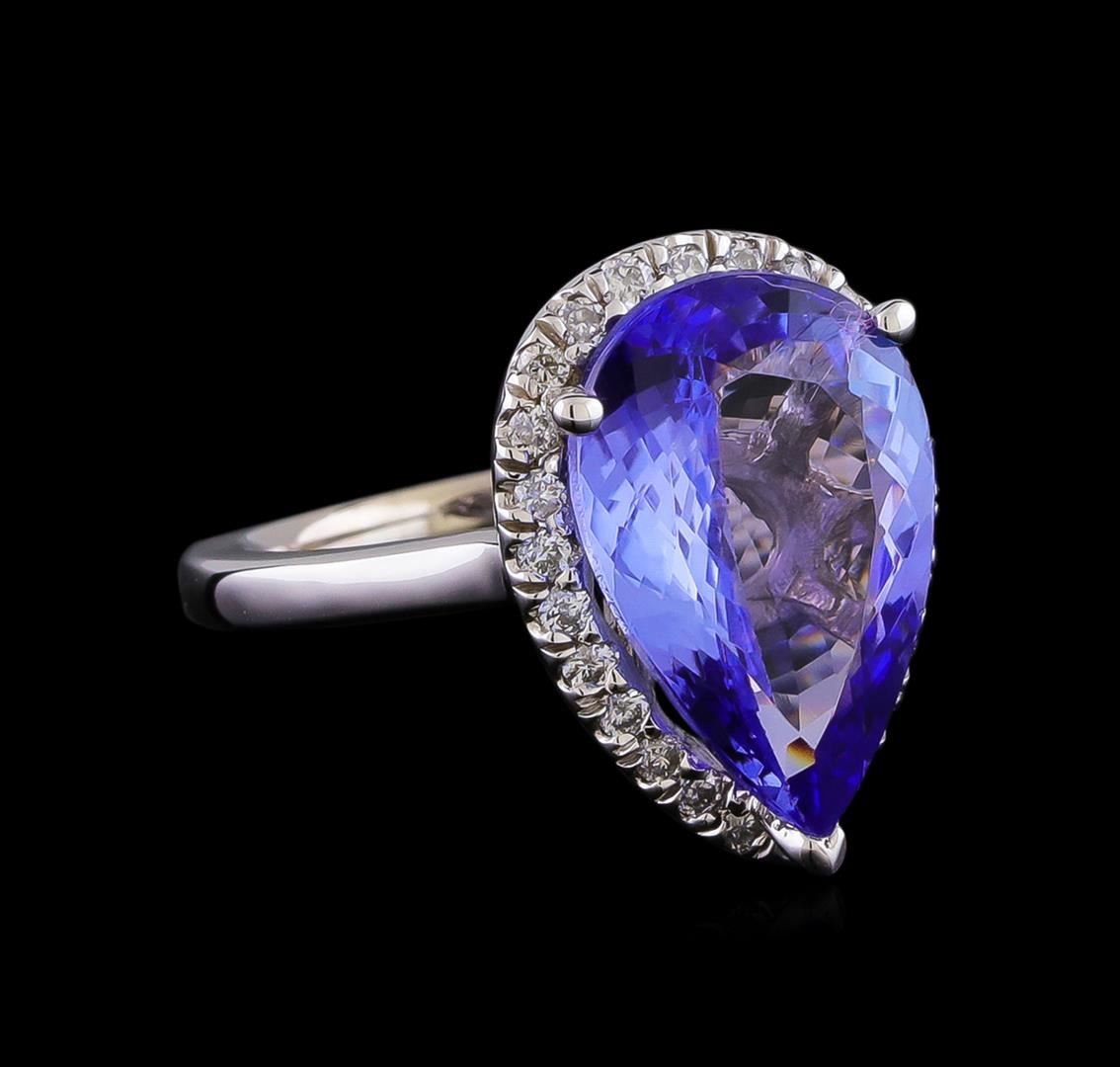 One electronically tested 14KT white gold lady's cast fashion ring with a cathedral halo with a bright polish finish. The featured lady's has a shank measuring 1.85 millimeters in width. Identified with markings of "14K". Condition is new, good workmanship. Containing: One prong set pear modified brilliant cut natural tanzanite, measuring 15.35 x 10.31 x 5.31mm, (depth est.) approximate weight of 5.82ct., clarity is eye clean, medium light, moderately strong, bluish violet color, (GIA bV 4/4), cut is very good. Transmitting light with no distortion, transparent. Colored gemstones are presumed to have been subjected to commonly used enhancement processes. Graded in the setting. Twenty-Five prong set round brilliant cut diamonds, measuring 1.55 - 1.50 x 0.95mm (depth est.) approximate total weight of 25 Stones = 0.33ct. Graded in the setting. Clarity: SI-1 to SI-2. Color: H - I. Cut Good. Total Weight of Colored Stones 5.82ct. Total Weight of Diamonds 0.33ct. Total Weight of Ring 5.50gm. GAS Appraised.