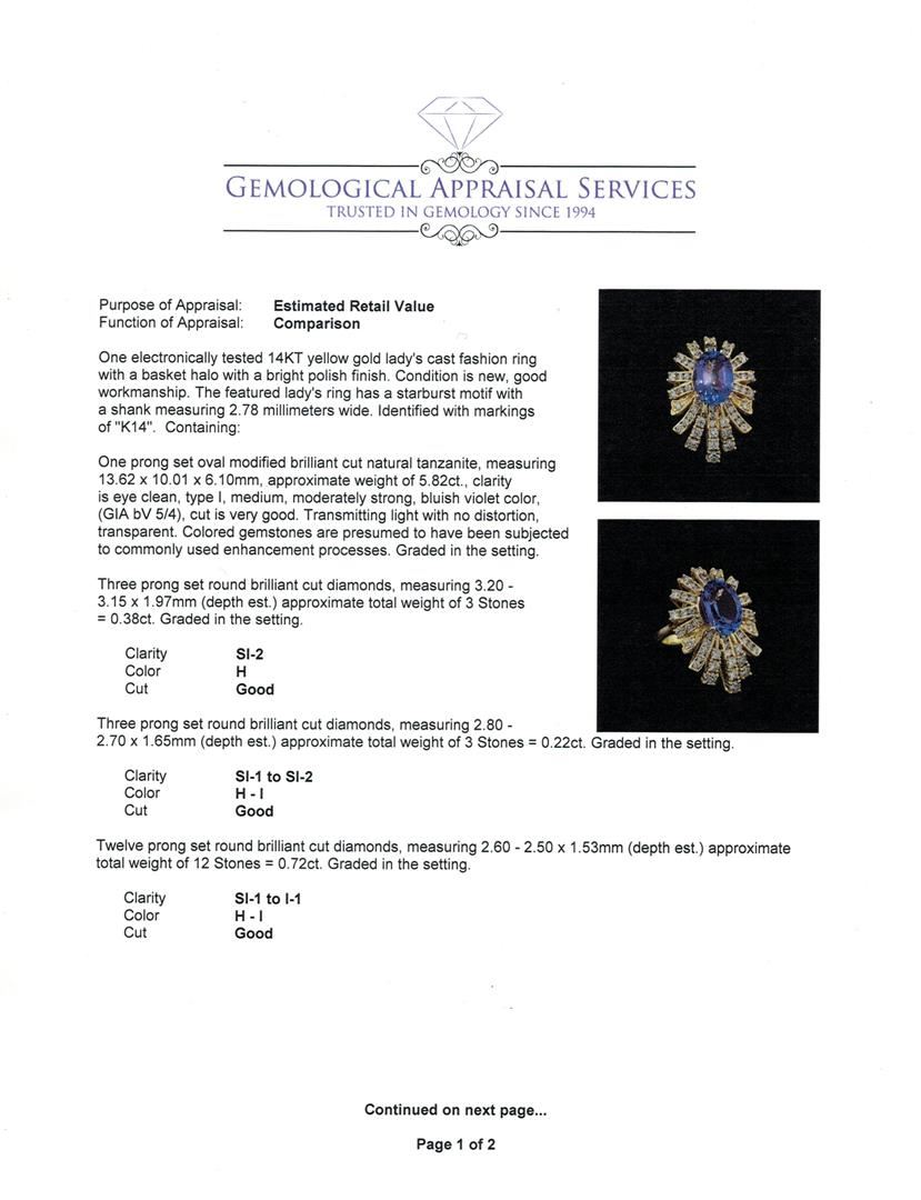 One electronically tested 14KT yellow gold lady's cast fashion ring with a basket halo with a bright polish finish. The featured lady's ring has a starburst motif with a shank measuring 2.78 millimeters wide. Identified with markings of "K14". Condition is new, good workmanship. Containing: One prong set oval modified brilliant cut natural tanzanite, measuring 13.62 x 10.01 x 6.10mm, approximate weight of 5.82ct., clarity is eye clean, type I, medium, moderately strong, bluish violet color, (GIA bV 5/4), cut is very good. Transmitting light with no distortion, transparent. Colored gemstones are presumed to have been subjected to commonly used enhancement processes. Graded in the setting. Three prong set round brilliant cut diamonds, measuring 3.20 - 3.15 x 1.97mm (depth est.) approximate total weight of 3 Stones = 0.38ct. Graded in the setting. Clarity: SI-2. Color: H. Cut Good Three prong set round brilliant cut diamonds, measuring 2.80 - 2.70 x 1.65mm (depth est.) approximate total weight of 3 Stones = 0.22ct. Graded in the setting. Clarity: SI-1 to SI-2. Color: H - I. Cut Good Twelve prong set round brilliant cut diamonds, measuring 2.60 - 2.50 x 1.53mm (depth est.) approximate total weight of 12 Stones = 0.72ct. Graded in the setting. Clarity: SI-1 to I-1. Color: H - I. Cut Good Two prong set round brilliant cut diamonds, measuring 2.10 - 2.00 x 1.27mm (depth est.) approximate total weight of 2 Stones = 0.06ct. Graded in the setting. Clarity: SI-1 to SI-2. Color: H - I. Cut Good Thirty-One channel set round brilliant cut diamonds, measuring 1.90 - 1.80 x 1.15mm (depth est.) approximate total weight of 31 Stones = 0.74ct. Graded in the setting. Clarity: SI-1 to I-1. Color: H - I. Cut Good. Total Weight of Colored Stones 5.82ct. Total Weight of Diamonds 2.12ct. Total Weight of Ring 10.80gm GAS Appraised at $15,155.00.