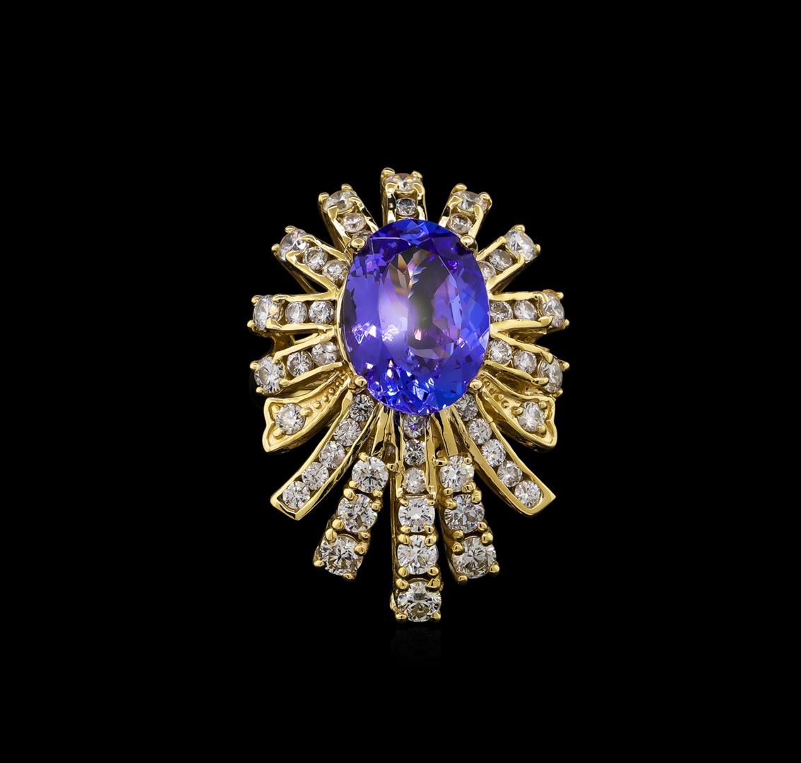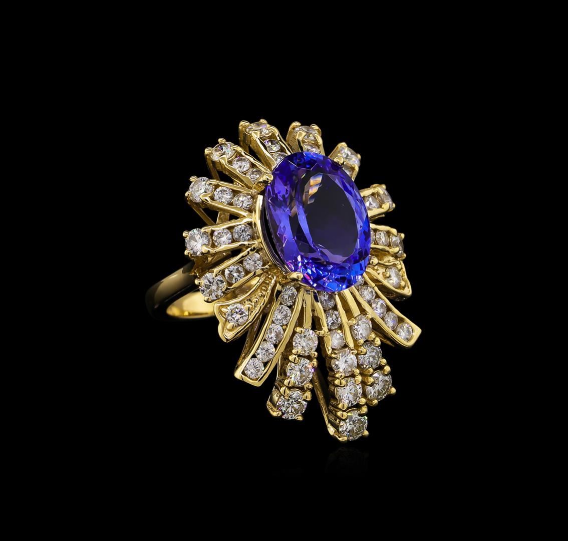 One electronically tested 14KT yellow gold lady's cast fashion ring with a basket halo with a bright polish finish. The featured lady's ring has a starburst motif with a shank measuring 2.78 millimeters wide. Identified with markings of "K14". Condition is new, good workmanship. Containing: One prong set oval modified brilliant cut natural tanzanite, measuring 13.62 x 10.01 x 6.10mm, approximate weight of 5.82ct., clarity is eye clean, type I, medium, moderately strong, bluish violet color, (GIA bV 5/4), cut is very good. Transmitting light with no distortion, transparent. Colored gemstones are presumed to have been subjected to commonly used enhancement processes. Graded in the setting. Three prong set round brilliant cut diamonds, measuring 3.20 - 3.15 x 1.97mm (depth est.) approximate total weight of 3 Stones = 0.38ct. Graded in the setting. Clarity: SI-2. Color: H. Cut Good Three prong set round brilliant cut diamonds, measuring 2.80 - 2.70 x 1.65mm (depth est.) approximate total weight of 3 Stones = 0.22ct. Graded in the setting. Clarity: SI-1 to SI-2. Color: H - I. Cut Good Twelve prong set round brilliant cut diamonds, measuring 2.60 - 2.50 x 1.53mm (depth est.) approximate total weight of 12 Stones = 0.72ct. Graded in the setting. Clarity: SI-1 to I-1. Color: H - I. Cut Good Two prong set round brilliant cut diamonds, measuring 2.10 - 2.00 x 1.27mm (depth est.) approximate total weight of 2 Stones = 0.06ct. Graded in the setting. Clarity: SI-1 to SI-2. Color: H - I. Cut Good Thirty-One channel set round brilliant cut diamonds, measuring 1.90 - 1.80 x 1.15mm (depth est.) approximate total weight of 31 Stones = 0.74ct. Graded in the setting. Clarity: SI-1 to I-1. Color: H - I. Cut Good. Total Weight of Colored Stones 5.82ct. Total Weight of Diamonds 2.12ct. Total Weight of Ring 10.80gm GAS Appraised at $15,155.00.