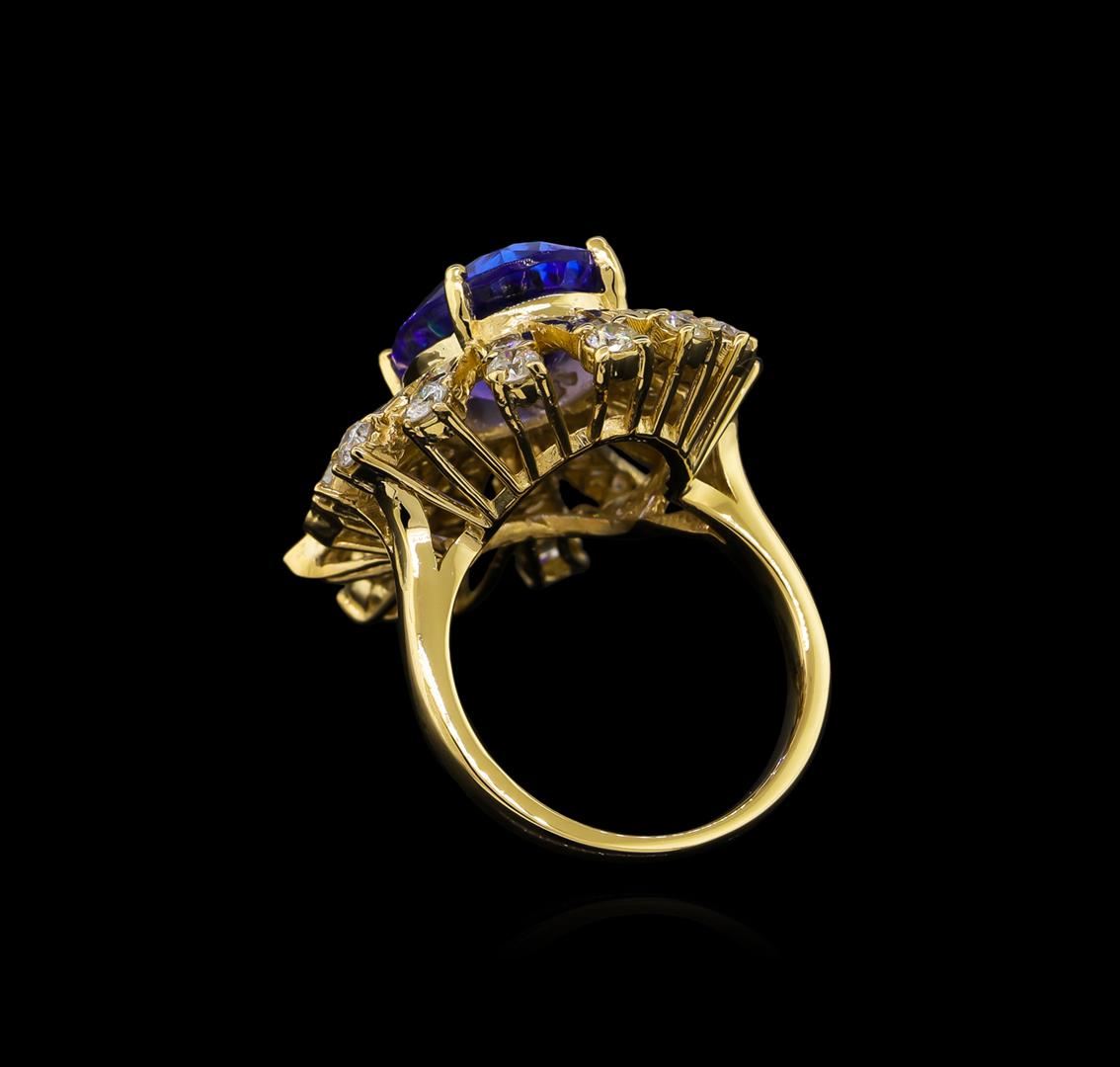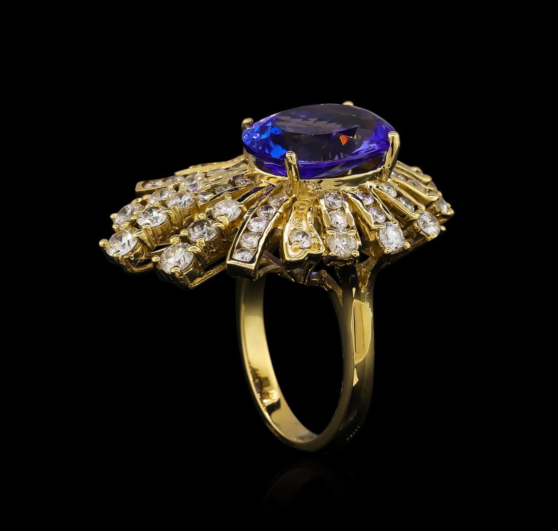 One electronically tested 14KT yellow gold lady's cast fashion ring with a basket halo with a bright polish finish. The featured lady's ring has a starburst motif with a shank measuring 2.78 millimeters wide. Identified with markings of "K14". Condition is new, good workmanship. Containing: One prong set oval modified brilliant cut natural tanzanite, measuring 13.62 x 10.01 x 6.10mm, approximate weight of 5.82ct., clarity is eye clean, type I, medium, moderately strong, bluish violet color, (GIA bV 5/4), cut is very good. Transmitting light with no distortion, transparent. Colored gemstones are presumed to have been subjected to commonly used enhancement processes. Graded in the setting. Three prong set round brilliant cut diamonds, measuring 3.20 - 3.15 x 1.97mm (depth est.) approximate total weight of 3 Stones = 0.38ct. Graded in the setting. Clarity: SI-2. Color: H. Cut Good Three prong set round brilliant cut diamonds, measuring 2.80 - 2.70 x 1.65mm (depth est.) approximate total weight of 3 Stones = 0.22ct. Graded in the setting. Clarity: SI-1 to SI-2. Color: H - I. Cut Good Twelve prong set round brilliant cut diamonds, measuring 2.60 - 2.50 x 1.53mm (depth est.) approximate total weight of 12 Stones = 0.72ct. Graded in the setting. Clarity: SI-1 to I-1. Color: H - I. Cut Good Two prong set round brilliant cut diamonds, measuring 2.10 - 2.00 x 1.27mm (depth est.) approximate total weight of 2 Stones = 0.06ct. Graded in the setting. Clarity: SI-1 to SI-2. Color: H - I. Cut Good Thirty-One channel set round brilliant cut diamonds, measuring 1.90 - 1.80 x 1.15mm (depth est.) approximate total weight of 31 Stones = 0.74ct. Graded in the setting. Clarity: SI-1 to I-1. Color: H - I. Cut Good. Total Weight of Colored Stones 5.82ct. Total Weight of Diamonds 2.12ct. Total Weight of Ring 10.80gm GAS Appraised.