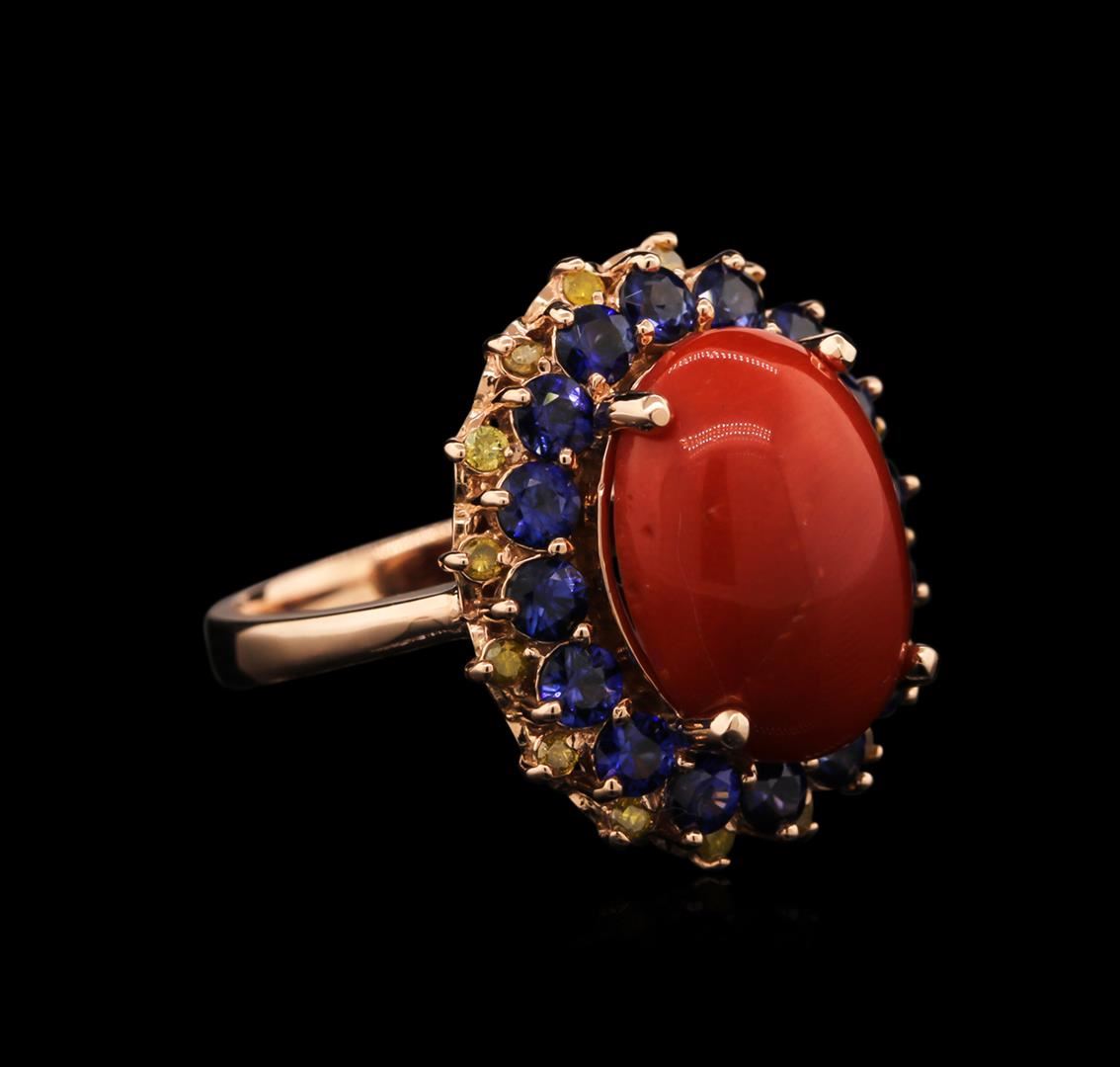 One ring featuring: 14KT rose gold weighing 7.08 grams containing one coral center stone with a total weight of 5.85ct, 16 blue sapphires with a total weight of 1.75ct, and 16 yellow diamonds with a total weight of 0.23ct.