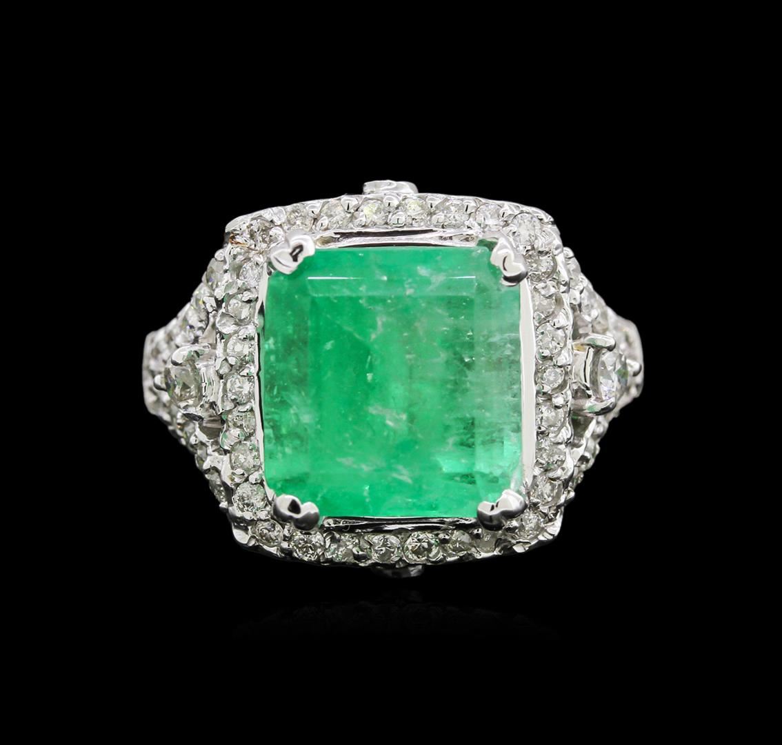 One electronically tested 14KT white gold lady's cast fashion ring with a halo with a bright polish finish. The featured lady's ring has a shank measuring 2.5 millimeters wide Identified with markings of "14K". Condition is new, good workmanship. Containing: One prong set emerald step cut natural emerald, measuring 11.02 x 10.55 x 7.00mm, approximate weight of 5.87ct., clarity is moderately included, type III, medium light, very slightly grayish, very slightly bluish green color, (GIA vslbG 4/3), cut is good. Transmitting light somewhat diffusely, transparent to translucent. Naturally occurring internal & external characteristics are present. Indications of oil residue. Graded in the setting. Two prong set round brilliant cut diamonds, measuring 2.70 - 2.60 x 1.72mm (depth est.) approximate total weight of 2 Stones = 0.16ct. Graded in the setting. Clarity: SI-1. Color: Good Fifty-Four prong set round brilliant cut diamonds, measuring 1.45 - 1.35 x 0.91mm (depth est.) approximate total weight of 54 Stones = 0.58ct. Graded in the setting. Clarity: SI-2 to I-1. Color: G - Good. Total Weight of Colored Stones 5.87ct. Total Weight of Diamonds 0.74ct. Total Weight of Ring 9.60gm. GAS Appraised at $9,675.00.