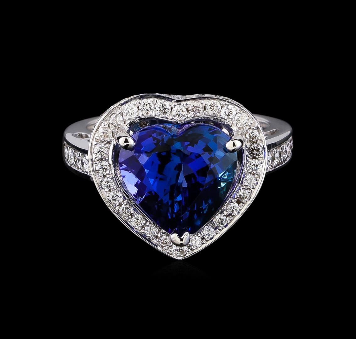 One electronically tested 14KT white gold lady's cast fashion ring with a basket halo with a bright polish finish. The featured lady's ring has a shank measuring 2.76 millimeters in width. Identified with markings of "K14". Condition is new, good workmanship. Containing: One prong set heart modified brilliant cut natural tanzanite, measuring 11.00 x 11.09 x 7.50mm, (depth est.) approximate weight of 5.87ct., clarity is eye clean, medium dark, strong, violetish blue color, (GIA vB 6/5), cut is very good. Transmitting light with no distortion, transparent. Colored gemstones are presumed to have been subjected to commonly used enhancement processes. Graded in the setting. Forty prong set round brilliant cut diamonds, measuring 1.60 - 1.50 x 0.93mm (depth est.) approximate total weight of 40 Stones = 0.55ct. Graded in the setting. Clarity: VS-2 to SI-1. Color: G - Good Thirty-Eight prong set round brilliant cut diamonds, measuring 1.30 - 1.25 x 0.77mm (depth est.) approximate total weight of 38 Stones = 0.30ct. Graded in the setting. Clarity: VS-2 to SI-1. Color: G - Good. Total Weight of Colored Stones 5.87ct. Total Weight of Diamonds 0.85ct. Total Weight of Ring 8.40gm GAS Appraised at $14,065.00.