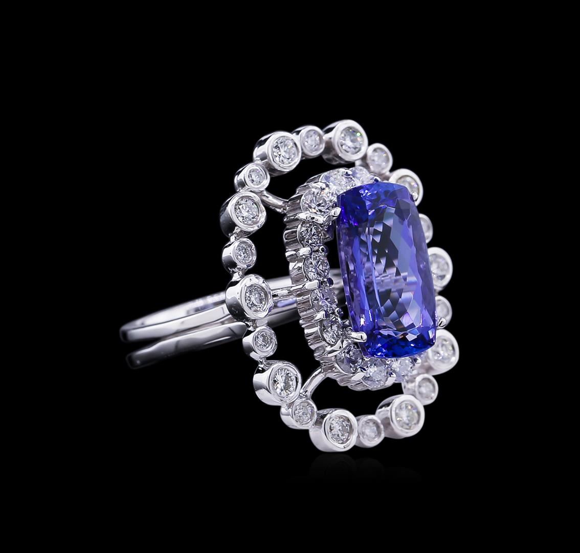 One electronically tested 14KT white gold lady's cast fashion ring with a double split shank with a bright polish finish. The featured lady's ring has a double shank measuring 3.84 millimeters wide. Identified with markings of "K14". Condition is new, good workmanship. Containing: One prong set rectangular cushion modified brilliant cut natural tanzanite, measuring 13.81 x 8.37 x 5.90mm, 10%. bulge factor, approximate weight of 5.87ct., clarity is eye clean, type I, medium, moderately strong, violetish blue color, (GIA vB 5/4), cut is very good. Transmitting light with no distortion, transparent. Colored gemstones are presumed to have been subjected to commonly used enhancement processes. Graded in the setting. Sixteen prong set round brilliant cut diamonds, measuring 2.50 - 2.40 x 1.47mm (depth est.) approximate total weight of 16 Stones = 0.86ct. Graded in the setting. Clarity: SI-1 to SI-2. Color: G - I. Cut Very Good Ten bezel set round brilliant cut diamonds, measuring 2.20 - 2.10 x 1.33mm (depth est.) approximate total weight of 10 Stones = 0.38ct. Graded in the setting. Clarity: SI-1 to SI-2. Color: G - Good Ten bezel set round brilliant cut diamonds, measuring 1.60 - 1.55 x 0.98mm (depth est.) approximate total weight of 10 Stones = 0.15ct. Graded in the setting. Clarity: SI-1 to I-1. Color: H - I. Cut Good. Total Weight of Colored Stones 5.87ct. Total Weight of Diamonds 1.39ct. Total Weight of Ring 8.60gm. GAS Appraised at $11,895.00.