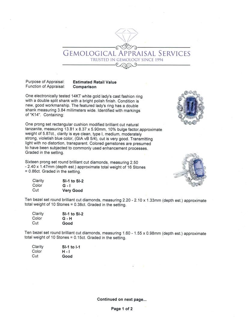One electronically tested 14KT white gold lady's cast fashion ring with a double split shank with a bright polish finish. The featured lady's ring has a double shank measuring 3.84 millimeters wide. Identified with markings of "K14". Condition is new, good workmanship. Containing: One prong set rectangular cushion modified brilliant cut natural tanzanite, measuring 13.81 x 8.37 x 5.90mm, 10%. bulge factor, approximate weight of 5.87ct., clarity is eye clean, type I, medium, moderately strong, violetish blue color, (GIA vB 5/4), cut is very good. Transmitting light with no distortion, transparent. Colored gemstones are presumed to have been subjected to commonly used enhancement processes. Graded in the setting. Sixteen prong set round brilliant cut diamonds, measuring 2.50 - 2.40 x 1.47mm (depth est.) approximate total weight of 16 Stones = 0.86ct. Graded in the setting. Clarity: SI-1 to SI-2. Color: G - I. Cut Very Good Ten bezel set round brilliant cut diamonds, measuring 2.20 - 2.10 x 1.33mm (depth est.) approximate total weight of 10 Stones = 0.38ct. Graded in the setting. Clarity: SI-1 to SI-2. Color: G - Good Ten bezel set round brilliant cut diamonds, measuring 1.60 - 1.55 x 0.98mm (depth est.) approximate total weight of 10 Stones = 0.15ct. Graded in the setting. Clarity: SI-1 to I-1. Color: H - I. Cut Good. Total Weight of Colored Stones 5.87ct. Total Weight of Diamonds 1.39ct. Total Weight of Ring 8.60gm. GAS Appraised at $11,895.00.