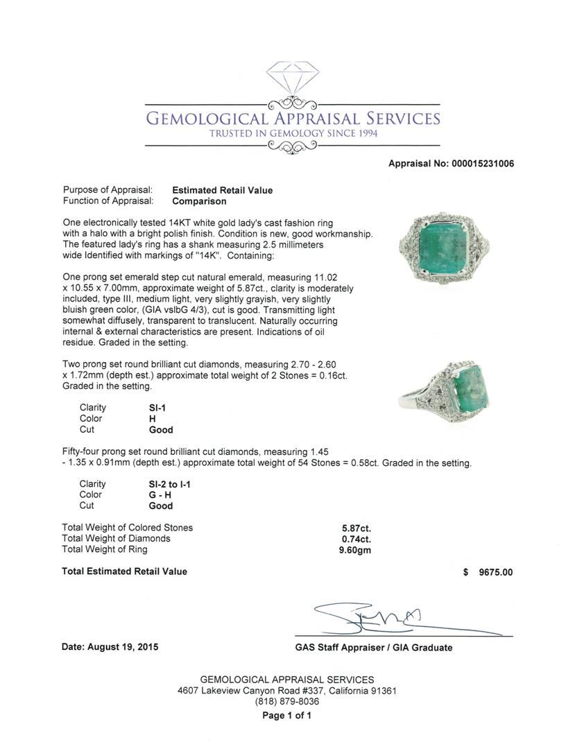 One electronically tested 14KT white gold lady's cast fashion ring with a halo with a bright polish finish. The featured lady's ring has a shank measuring 2.5 millimeters wide Identified with markings of "14K". Condition is new, good workmanship. Containing: One prong set emerald step cut natural emerald, measuring 11.02 x 10.55 x 7.00mm, approximate weight of 5.87ct., clarity is moderately included, type III, medium light, very slightly grayish, very slightly bluish green color, (GIA vslbG 4/3), cut is good. Transmitting light somewhat diffusely, transparent to translucent. Naturally occurring internal & external characteristics are present. Indications of oil residue. Graded in the setting. Two prong set round brilliant cut diamonds, measuring 2.70 - 2.60 x 1.72mm (depth est.) approximate total weight of 2 Stones = 0.16ct. Graded in the setting. Clarity: SI-1. Color: Good Fifty-Four prong set round brilliant cut diamonds, measuring 1.45 - 1.35 x 0.91mm (depth est.) approximate total weight of 54 Stones = 0.58ct. Graded in the setting. Clarity: SI-2 to I-1. Color: G - Good. Total Weight of Colored Stones 5.87ct. Total Weight of Diamonds 0.74ct. Total Weight of Ring 9.60gm. GAS Appraised at $9,675.00.