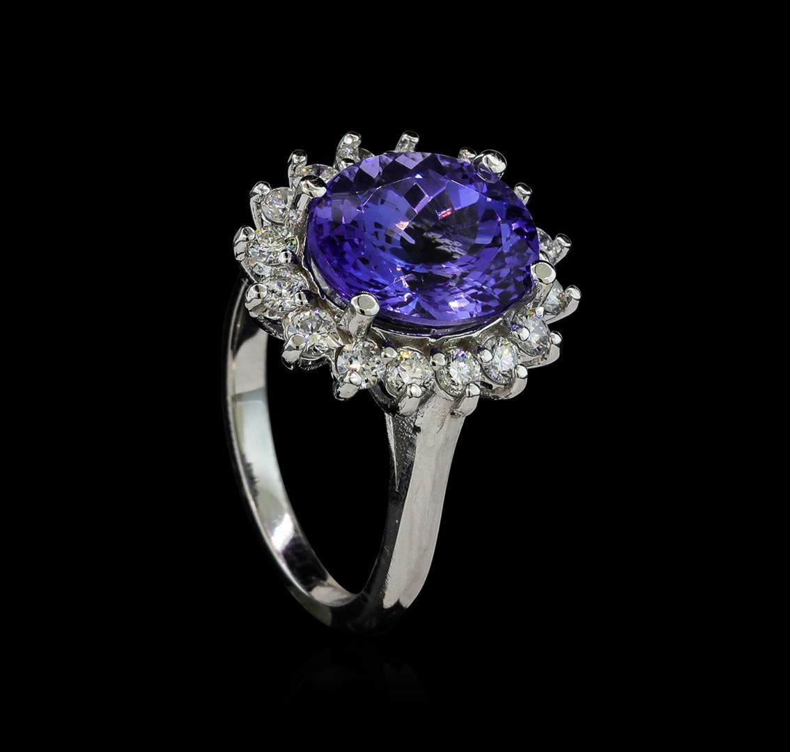 One electronically tested 14KT white gold lady's cast fashion ring with a basket halo with a bright polish finish. The featured lady's ring has a shank measuring 2.15 millimeters wide. Identified with markings of '14K'. Condition is new, good workmanship. Containing: One prong set oval modified brilliant cut natural tanzanite, measuring 11.95 x 10.06 x 7.29mm, (depth est.) approximate weight of 5.88ct., clarity is eye clean, medium light, very slightly grayish, bluish violet color, (GIA bV 4/3), cut is very good. Transmitting light with no distortion, transparent. Colored gemstones are presumed to have been subjected to commonly used enhancement processes. Graded in the setting. Sixteen prong set round brilliant cut diamonds, measuring 2.45 - 2.35 x 1.46mm (depth est.) approximate total weight of 16 Stones = 0.82ct. Graded in the setting. Clarity SI-1 to I-1. Color: H - I Cut Good. Total Weight of Colored Stones 5.88ct.. Total Weight of Diamonds 0.82ct.. Total Weight of Ring 6.90gm GAS Appraised at $8,470.00.