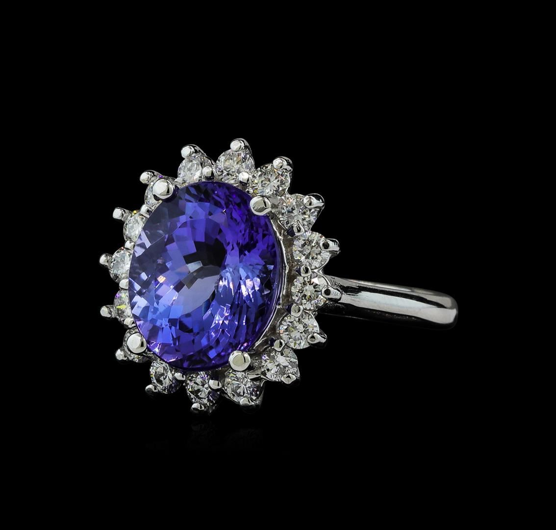 One electronically tested 14KT white gold lady's cast fashion ring with a basket halo with a bright polish finish. The featured lady's ring has a shank measuring 2.15 millimeters wide. Identified with markings of '14K'. Condition is new, good workmanship. Containing: One prong set oval modified brilliant cut natural tanzanite, measuring 11.95 x 10.06 x 7.29mm, (depth est.) approximate weight of 5.88ct., clarity is eye clean, medium light, very slightly grayish, bluish violet color, (GIA bV 4/3), cut is very good. Transmitting light with no distortion, transparent. Colored gemstones are presumed to have been subjected to commonly used enhancement processes. Graded in the setting. Sixteen prong set round brilliant cut diamonds, measuring 2.45 - 2.35 x 1.46mm (depth est.) approximate total weight of 16 Stones = 0.82ct. Graded in the setting. Clarity SI-1 to I-1. Color: H - I Cut Good. Total Weight of Colored Stones 5.88ct.. Total Weight of Diamonds 0.82ct.. Total Weight of Ring 6.90gm GAS Appraised at $8,470.00.