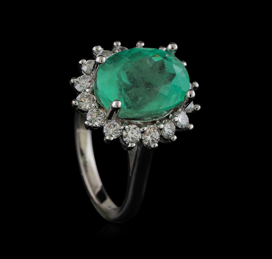 One electronically tested 14KT white gold lady's cast fashion ring with a basket halo with a bright polish finish. The featured lady's ring has a shank measuring 2.05 millimeters wide. Identified with markings of '14K'. Condition is new, good workmanship. Containing: One prong set oval modified brilliant cut natural emerald, measuring 12.49 x 9.67 x 8.88mm, (depth est.) approximate weight of 5.89ct., clarity is heavily included, medium light, very slightly grayish, green color, (GIA G 4/3), cut is good. Transmitting light somewhat diffusely, semi-transparent to translucent. Naturally occurring internal & external characteristics are present. Indications of oil residue. Clarity enhanced. Colored gemstones are presumed to have been subjected to commonly used enhancement processes. Graded loose prior to setting in the GIA Laboratory, Report #6173665069. Sixteen prong set round brilliant cut diamonds, measuring 2.50 - 2.40 x 1.47mm (depth est.) approximate total weight of 16 Stones = 0.85ct. Graded in the setting. Clarity SI-1 to SI-2. Color: H - I Cut Good. Total Weight of Colored Stones 5.89ct.. Total Weight of Diamonds 0.85ct.. Total Weight of Ring 6.30gm GAS Appraised.