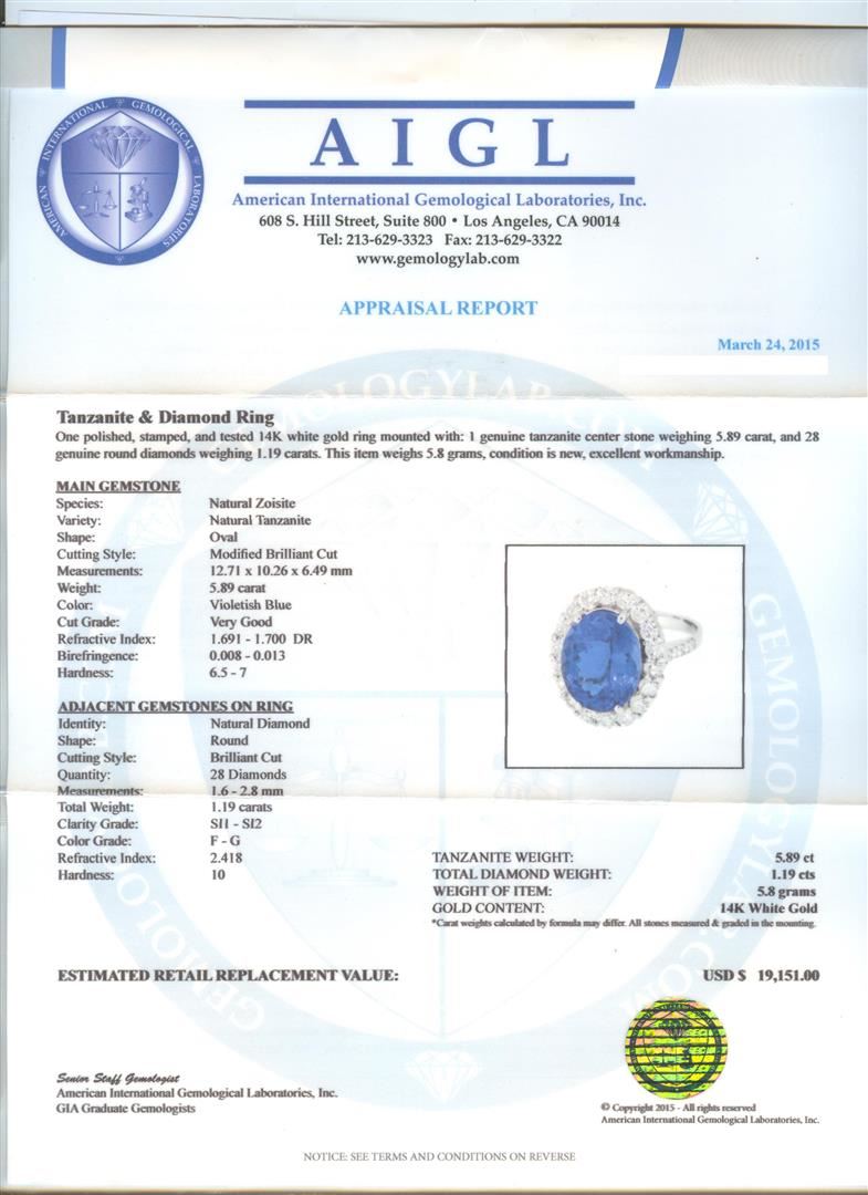 One polished, stamped, and tested 14K white gold ring mounted with: 1 genuine tanzanite center stone weighing 5.89 carat, and 28 genuine round diamonds weighing 1.19 carats. This item weighs 5.8 grams, condition is new, excellent workmanship. Main Gemstone: Identity: Natural Zoisite. Variety: Natural Tanzanite. Shape: Oval. Cutting Style: Modified Brilliant Cut. Measurements: 12.71 x 10.26 x 6.49 mm. Weight: 5.89 carat. Color Grade: Violetish Blue. Cut Grade: Very Good. Refractive Index: 1.691 - 1.700 DR. Birefringence: 0.008 - 0.013. Hardness: 6.5 - 7. Adjacent Gemstones On Ring: Identity: Natural Diamond. Shape: Round. Cutting Style: Brilliant Cut. Quantity: 28 Diamonds. Measurements: 1.6-2.8 mm. Total Weight: 1.19 crats. Clarity Grade: SI1-SI2. Color Grade: F-G. Refractive Index: 2.418. Hardness: 10. Tanzanite Weight: 5.89ct. Total Diamond Weight: 1.19cts. Weight Of Item: 5.8 grams. Gold Content: 14K White Gold. AIGL Appraised at $19,151.00.