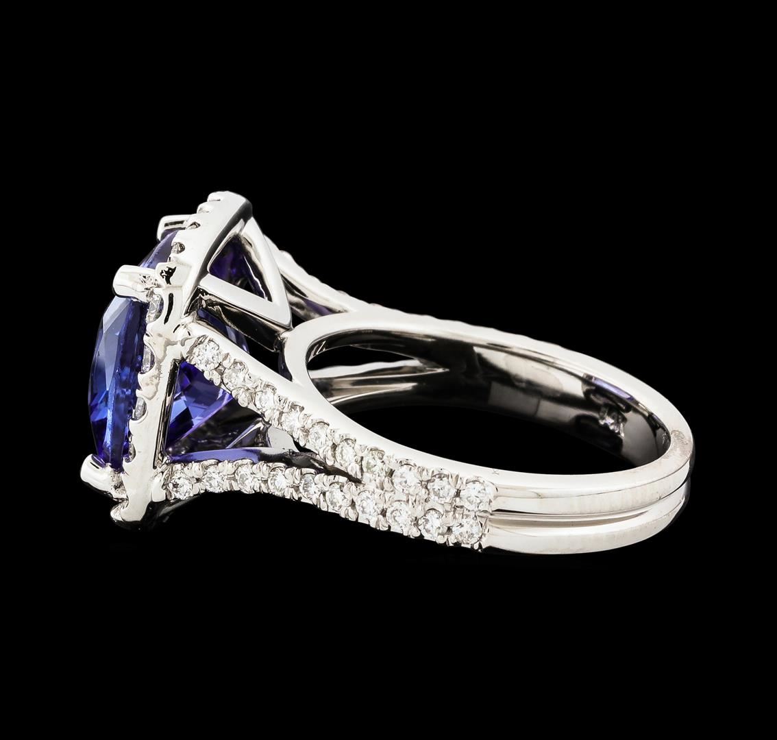 One electronically tested 14KT white gold lady's cast fashion ring with a split shank halo with a bright polish finish. The featured lady's ring has a double shank measuring 3.31 millimeters wide. Identified with markings of '14K'. Condition is new, good workmanship. Containing: One prong set square cushion modified brilliant cut natural tanzanite, measuring 10.95 x 10.88 x 6.82mm, (depth est.) approximate weight of 5.90ct., clarity is eye clean, medium, moderately strong, bluish violet color, (GIA bV 5/4), cut is very good. Transmitting light with no distortion, transparent. Colored gemstones are presumed to have been subjected to commonly used enhancement processes. Graded in the setting. Twenty prong set round brilliant cut diamonds, measuring 1.85 - 1.75 x 1.12mm (depth est.) approximate total weight of 20 Stones = 0.45ct. Graded in the setting. Clarity SI-1 to I-1. Color: H - I Cut Good Forty prong set round brilliant cut diamonds, measuring 1.40 - 1.35 x 0.86mm (depth est.) approximate total weight of 40 Stones = 0.40ct. Graded in the setting. Clarity SI-1 to I-1. Color: H - I Cut Good. Total Weight of Colored Stones 5.90ct.. Total Weight of Diamonds 0.85ct.. Total Weight of Ring 7.30gm. GAS Appraised at $10,615.00.