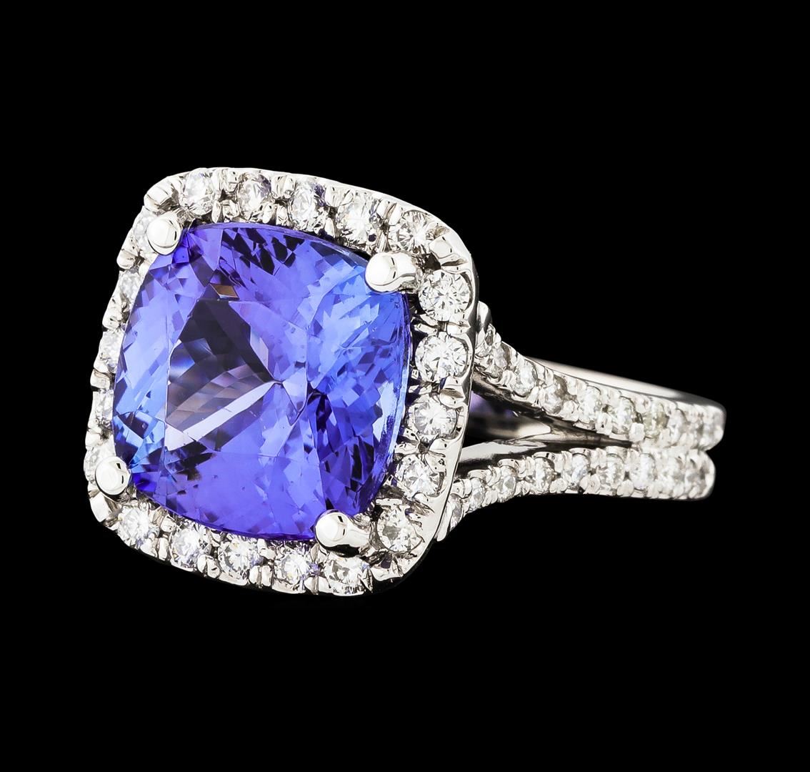 One electronically tested 14KT white gold lady's cast fashion ring with a split shank halo with a bright polish finish. The featured lady's ring has a double shank measuring 3.31 millimeters wide. Identified with markings of '14K'. Condition is new, good workmanship. Containing: One prong set square cushion modified brilliant cut natural tanzanite, measuring 10.95 x 10.88 x 6.82mm, (depth est.) approximate weight of 5.90ct., clarity is eye clean, medium, moderately strong, bluish violet color, (GIA bV 5/4), cut is very good. Transmitting light with no distortion, transparent. Colored gemstones are presumed to have been subjected to commonly used enhancement processes. Graded in the setting. Twenty prong set round brilliant cut diamonds, measuring 1.85 - 1.75 x 1.12mm (depth est.) approximate total weight of 20 Stones = 0.45ct. Graded in the setting. Clarity SI-1 to I-1. Color: H - I Cut Good Forty prong set round brilliant cut diamonds, measuring 1.40 - 1.35 x 0.86mm (depth est.) approximate total weight of 40 Stones = 0.40ct. Graded in the setting. Clarity SI-1 to I-1. Color: H - I Cut Good. Total Weight of Colored Stones 5.90ct.. Total Weight of Diamonds 0.85ct.. Total Weight of Ring 7.30gm. GAS Appraised at $10,615.00.