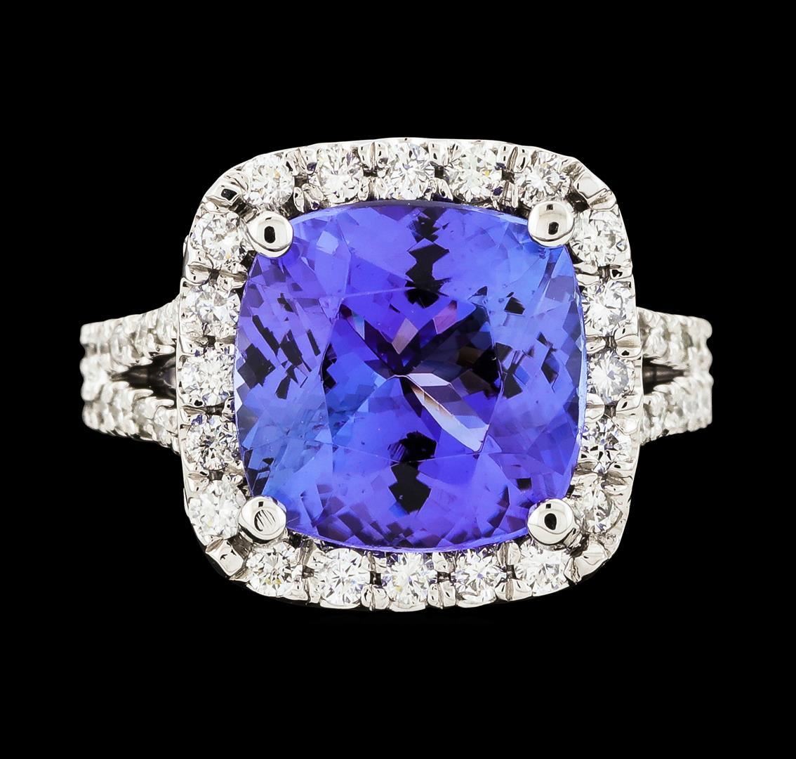 One electronically tested 14KT white gold lady's cast fashion ring with a split shank halo with a bright polish finish. The featured lady's ring has a double shank measuring 3.31 millimeters wide. Identified with markings of '14K'. Condition is new, good workmanship. Containing: One prong set square cushion modified brilliant cut natural tanzanite, measuring 10.95 x 10.88 x 6.82mm, (depth est.) approximate weight of 5.90ct., clarity is eye clean, medium, moderately strong, bluish violet color, (GIA bV 5/4), cut is very good. Transmitting light with no distortion, transparent. Colored gemstones are presumed to have been subjected to commonly used enhancement processes. Graded in the setting. Twenty prong set round brilliant cut diamonds, measuring 1.85 - 1.75 x 1.12mm (depth est.) approximate total weight of 20 Stones = 0.45ct. Graded in the setting. Clarity SI-1 to I-1. Color: H - I Cut Good Forty prong set round brilliant cut diamonds, measuring 1.40 - 1.35 x 0.86mm (depth est.) approximate total weight of 40 Stones = 0.40ct. Graded in the setting. Clarity SI-1 to I-1. Color: H - I Cut Good. Total Weight of Colored Stones 5.90ct.. Total Weight of Diamonds 0.85ct.. Total Weight of Ring 7.30gm. GAS Appraised.