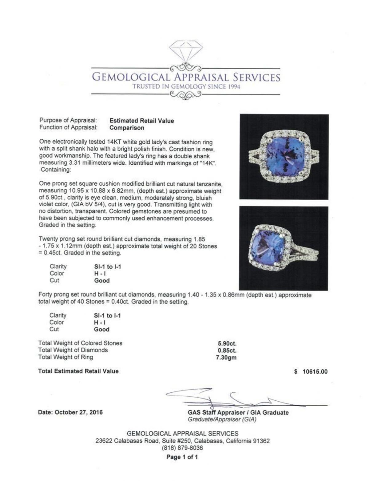 One electronically tested 14KT white gold lady's cast fashion ring with a split shank halo with a bright polish finish. The featured lady's ring has a double shank measuring 3.31 millimeters wide. Identified with markings of '14K'. Condition is new, good workmanship. Containing: One prong set square cushion modified brilliant cut natural tanzanite, measuring 10.95 x 10.88 x 6.82mm, (depth est.) approximate weight of 5.90ct., clarity is eye clean, medium, moderately strong, bluish violet color, (GIA bV 5/4), cut is very good. Transmitting light with no distortion, transparent. Colored gemstones are presumed to have been subjected to commonly used enhancement processes. Graded in the setting. Twenty prong set round brilliant cut diamonds, measuring 1.85 - 1.75 x 1.12mm (depth est.) approximate total weight of 20 Stones = 0.45ct. Graded in the setting. Clarity SI-1 to I-1. Color: H - I Cut Good Forty prong set round brilliant cut diamonds, measuring 1.40 - 1.35 x 0.86mm (depth est.) approximate total weight of 40 Stones = 0.40ct. Graded in the setting. Clarity SI-1 to I-1. Color: H - I Cut Good. Total Weight of Colored Stones 5.90ct.. Total Weight of Diamonds 0.85ct.. Total Weight of Ring 7.30gm. GAS Appraised.