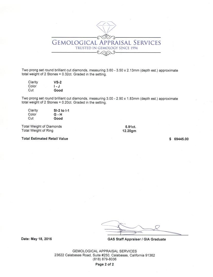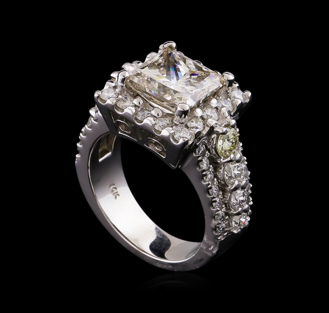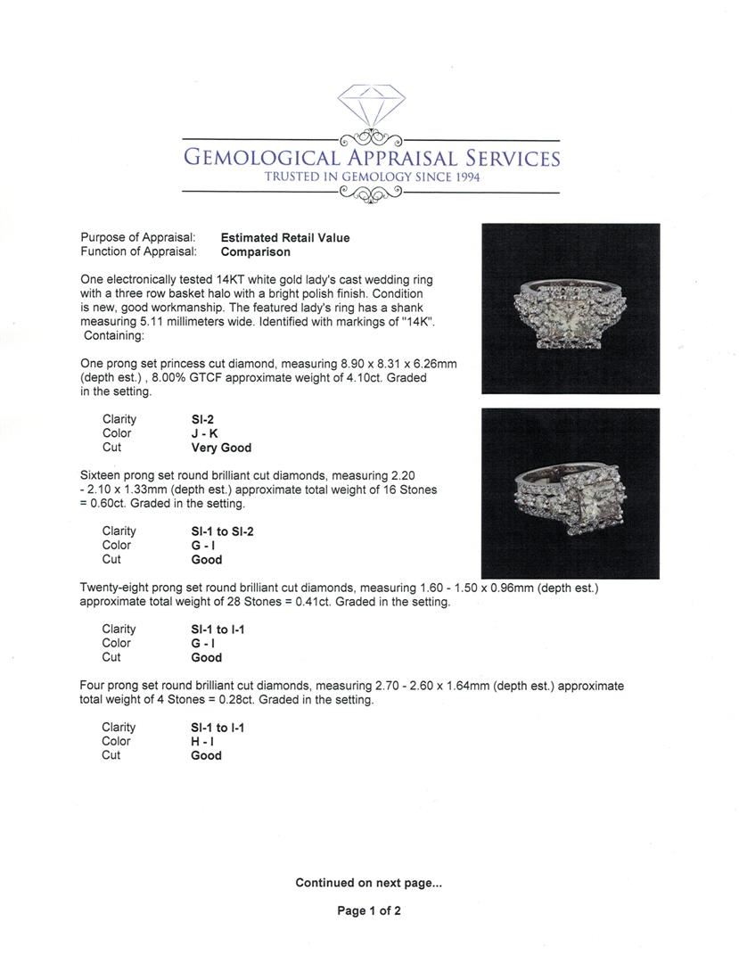 One electronically tested 14KT white gold lady's cast wedding ring with a three row basket halo with a bright polish finish. The featured lady's ring has a shank measuring 5.11 millimeters wide. Identified with markings of "14K". Condition is new, good workmanship. Containing: One prong set princess cut diamond, measuring 8.90 x 8.31 x 6.26mm (depth est.) , 8.00.%. GTCF approximate weight of 4.10ct. Graded in the setting. Clarity: SI-2. Color: J - K. Cut Very Good Sixteen prong set round brilliant cut diamonds, measuring 2.20 - 2.10 x 1.33mm (depth est.) approximate total weight of 16 Stones = 0.60ct. Graded in the setting. Clarity: SI-1 to SI-2. Color: G - I. Cut Good Twenty-Eight prong set round brilliant cut diamonds, measuring 1.60 - 1.50 x 0.96mm (depth est.) approximate total weight of 28 Stones = 0.41ct. Graded in the setting. Clarity: SI-1 to I-1. Color: G - I. Cut Good Four prong set round brilliant cut diamonds, measuring 2.70 - 2.60 x 1.64mm (depth est.) approximate total weight of 4 Stones = 0.28ct. Graded in the setting. Clarity: SI-1 to I-1. Color: H - I. Cut Good Two prong set round brilliant cut diamonds, measuring 3.60 - 3.50 x 2.13mm (depth est.) approximate total weight of 2 Stones = 0.32ct. Graded in the setting. Clarity: VS-2. Color: I - J. Cut Good Two prong set round brilliant cut diamonds, measuring 3.00 - 2.90 x 1.83mm (depth est.) approximate total weight of 2 Stones = 0.20ct. Graded in the setting. Clarity: SI-2 to I-1. Color: G - Good. Total Weight of Diamonds 5.91ct. Total Weight of Ring 12.20gm. GAS Appraised at $69,445.00.