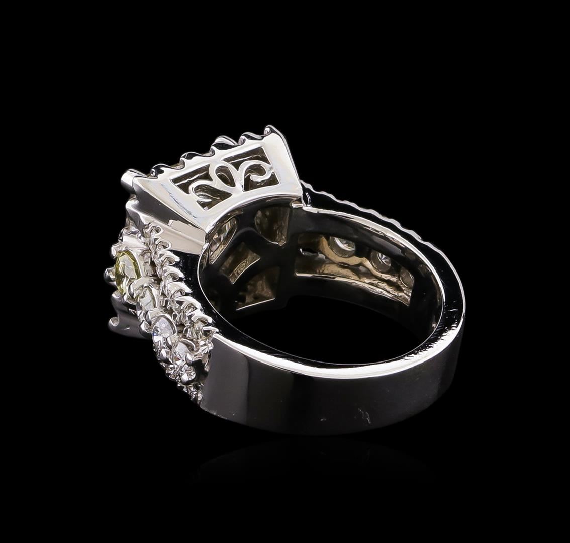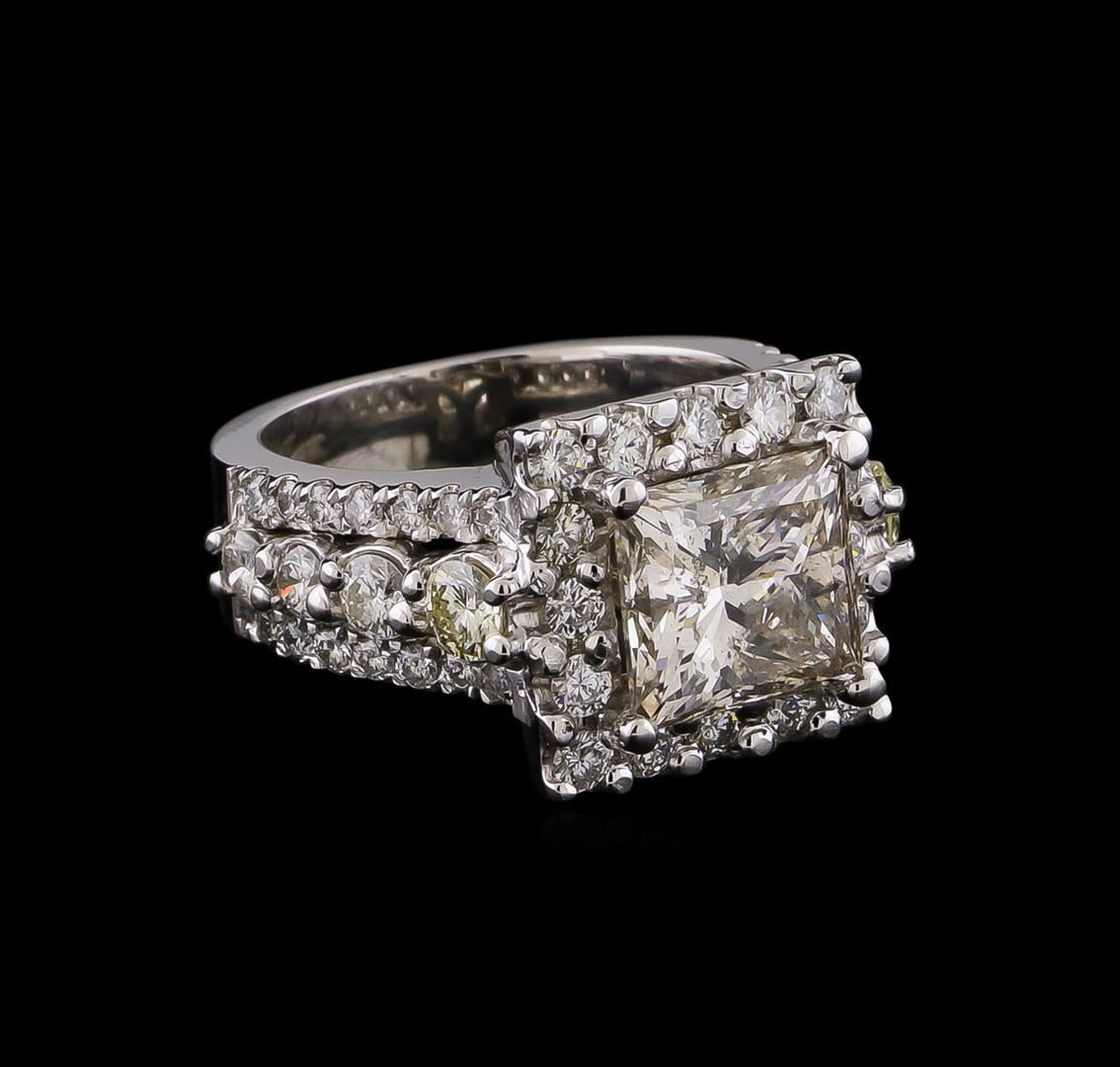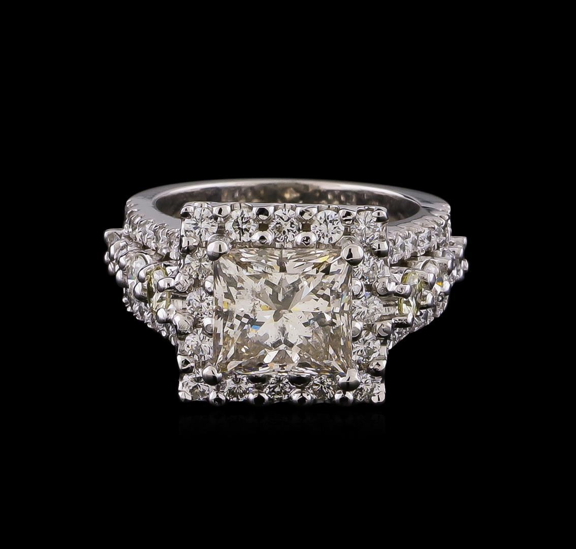 One electronically tested 14KT white gold lady's cast wedding ring with a three row basket halo with a bright polish finish. The featured lady's ring has a shank measuring 5.11 millimeters wide. Identified with markings of "14K". Condition is new, good workmanship. Containing: One prong set princess cut diamond, measuring 8.90 x 8.31 x 6.26mm (depth est.) , 8.00.%. GTCF approximate weight of 4.10ct. Graded in the setting. Clarity: SI-2. Color: J - K. Cut Very Good Sixteen prong set round brilliant cut diamonds, measuring 2.20 - 2.10 x 1.33mm (depth est.) approximate total weight of 16 Stones = 0.60ct. Graded in the setting. Clarity: SI-1 to SI-2. Color: G - I. Cut Good Twenty-Eight prong set round brilliant cut diamonds, measuring 1.60 - 1.50 x 0.96mm (depth est.) approximate total weight of 28 Stones = 0.41ct. Graded in the setting. Clarity: SI-1 to I-1. Color: G - I. Cut Good Four prong set round brilliant cut diamonds, measuring 2.70 - 2.60 x 1.64mm (depth est.) approximate total weight of 4 Stones = 0.28ct. Graded in the setting. Clarity: SI-1 to I-1. Color: H - I. Cut Good Two prong set round brilliant cut diamonds, measuring 3.60 - 3.50 x 2.13mm (depth est.) approximate total weight of 2 Stones = 0.32ct. Graded in the setting. Clarity: VS-2. Color: I - J. Cut Good Two prong set round brilliant cut diamonds, measuring 3.00 - 2.90 x 1.83mm (depth est.) approximate total weight of 2 Stones = 0.20ct. Graded in the setting. Clarity: SI-2 to I-1. Color: G - Good. Total Weight of Diamonds 5.91ct. Total Weight of Ring 12.20gm. GAS Appraised at $69,445.00.