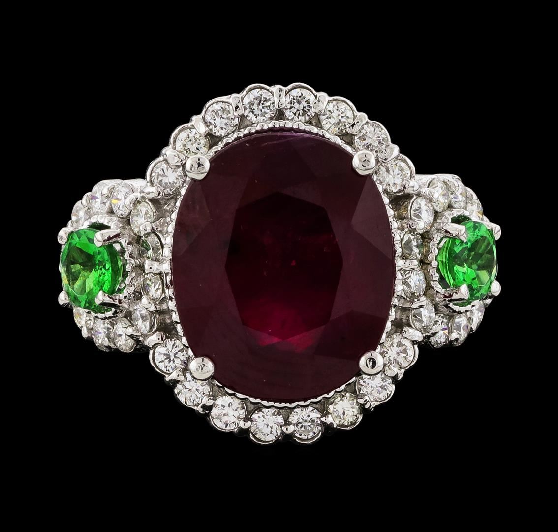 One Ruby, Tsavorite, and Diamond Ring featuring: 14KT White Gold with a total weight of 5.40 grams, Ruby with a total weight of 5.91ct, Tsavorite with a total weight of 0.44ctw, and 40 Diamonds with a total weight of 0.61ctw.